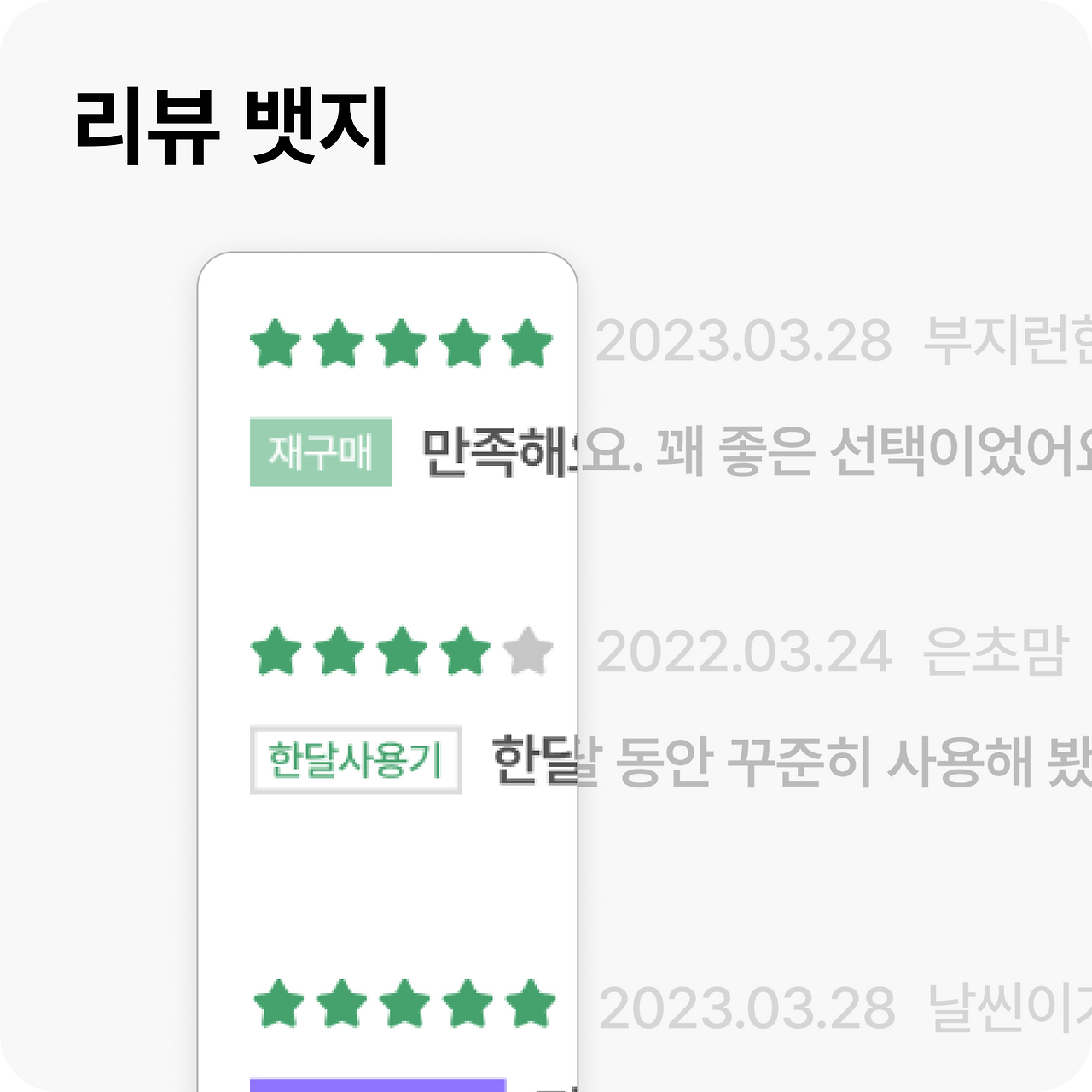 : 재구매/NEW/한 달 사용기 등의 뱃지를 어울리는 리뷰에 달아주는 기능이에요.
