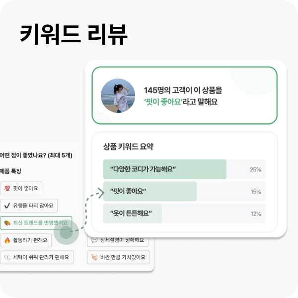 리뷰의 중요성 : 소비자의 78% 이상이 구매 전 리뷰를 확인해요. 또, 광고보다 리뷰를 신뢰하는 소비자의 비율도 75% 이상이죠. 심지어 최근 제삼자 쿠키 제한, 개인정보보호정책으로 인한 마케팅 저하와 불경기로 유입된 고객은 절대 놓치지 말아야 하기에, 리뷰는 갈수록 더 중요해지고 있어요.