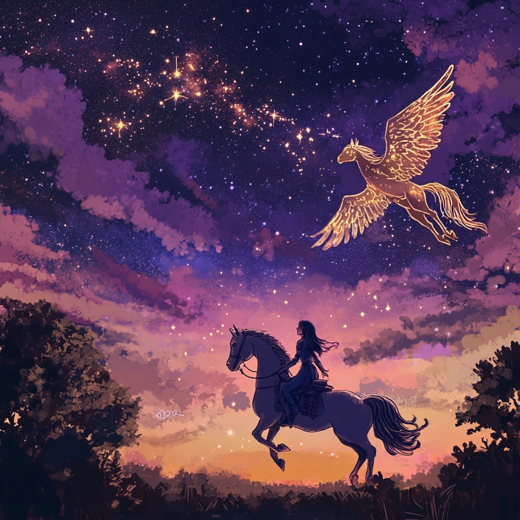 가을 하늘에서 가장 먼저 눈에 띄는 것은 페가수스자리입니다. 하늘을 나는 말, 페가수스는 꿈의 세계로 데려가 줄 것만 같습니다. 페가수스를 볼 때마다 "저 별을 따라가면 어디로 갈 수 있을까?"라는 생각을 하곤 했습니다. 페가수스는 은하수 위를 달리는 상상의 친구처럼 느껴졌습니다. 할머니는 저에게 "페가수스를 보면 소원을 빌어보렴. 이 말은 하늘을 날아다니니, 네 소원을 들어줄지도 몰라"라고 하셨지요.