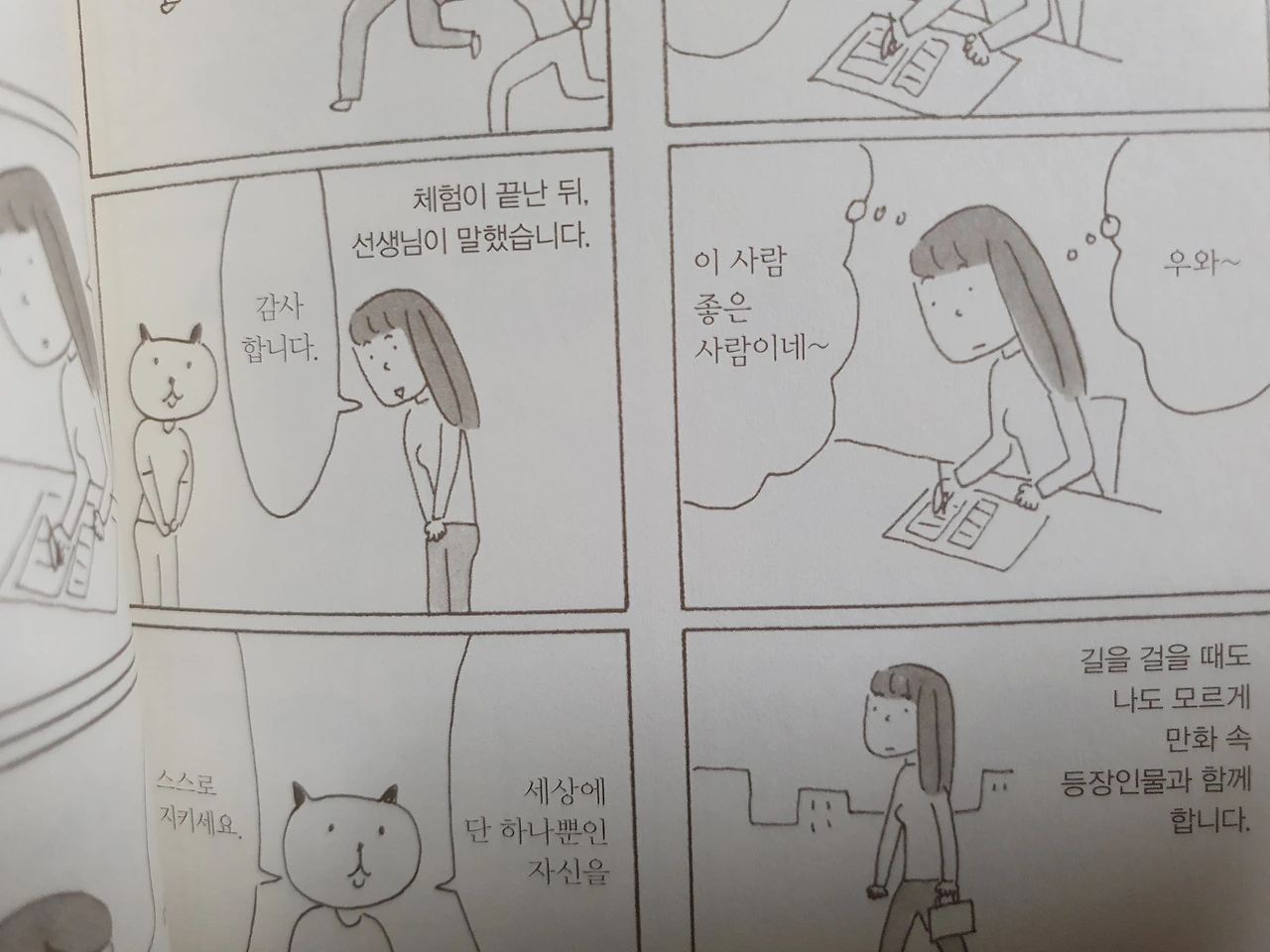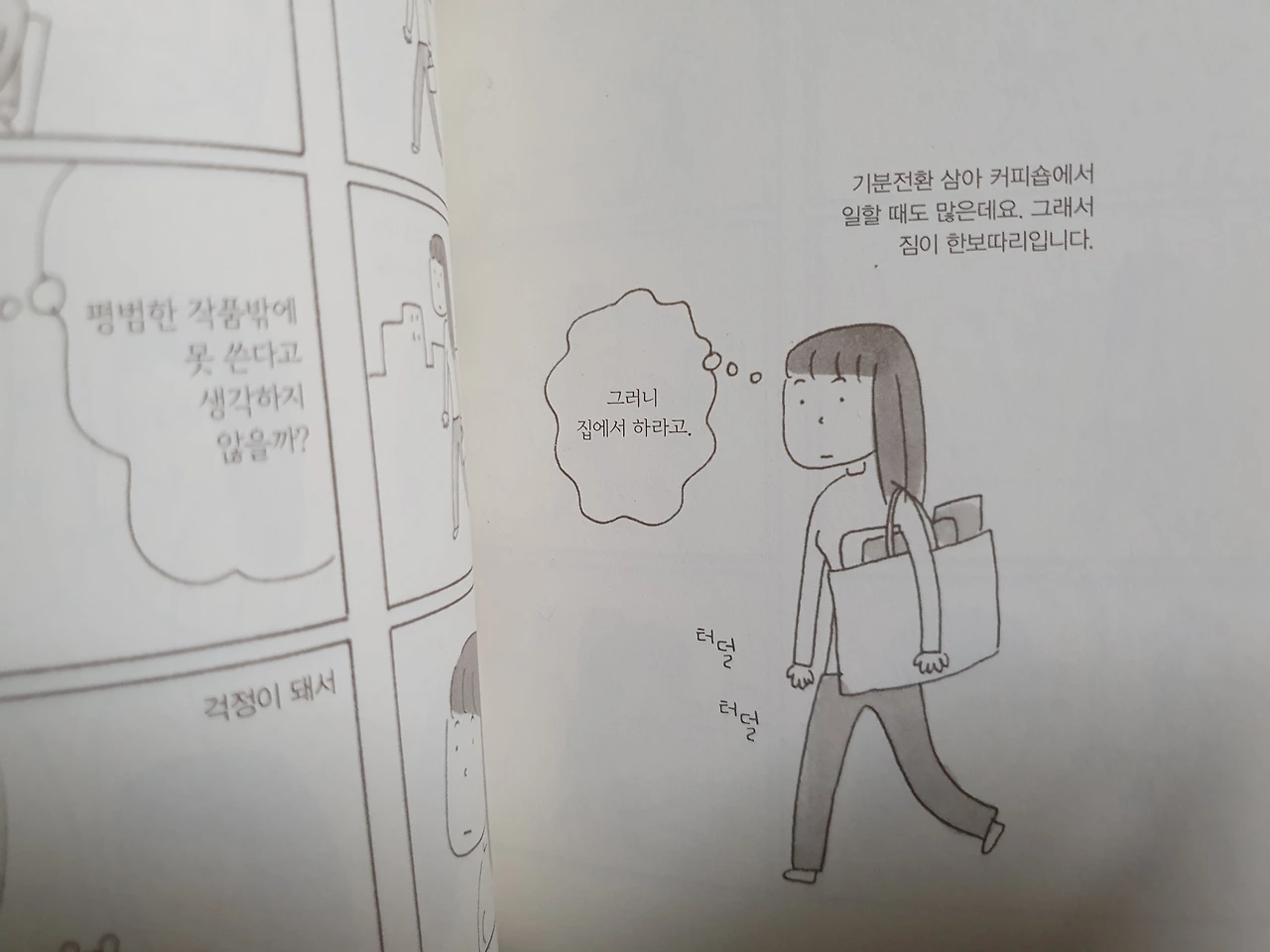 읽다 보면 그녀의 이런 솔직함이 자신을 돌아보게 만듭니다. 누구나 느낄 수 있는 불안감과 두려움을 솔직하게 인정하면서도, 느긋한 태도로 이를 받아들이는 마스다 미리의 모습이 참으로 인상적입니다.