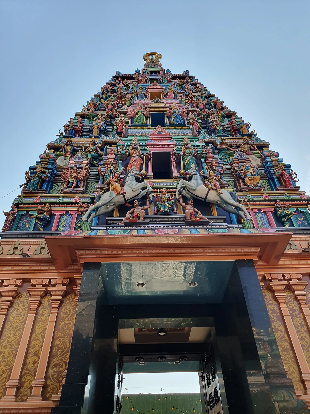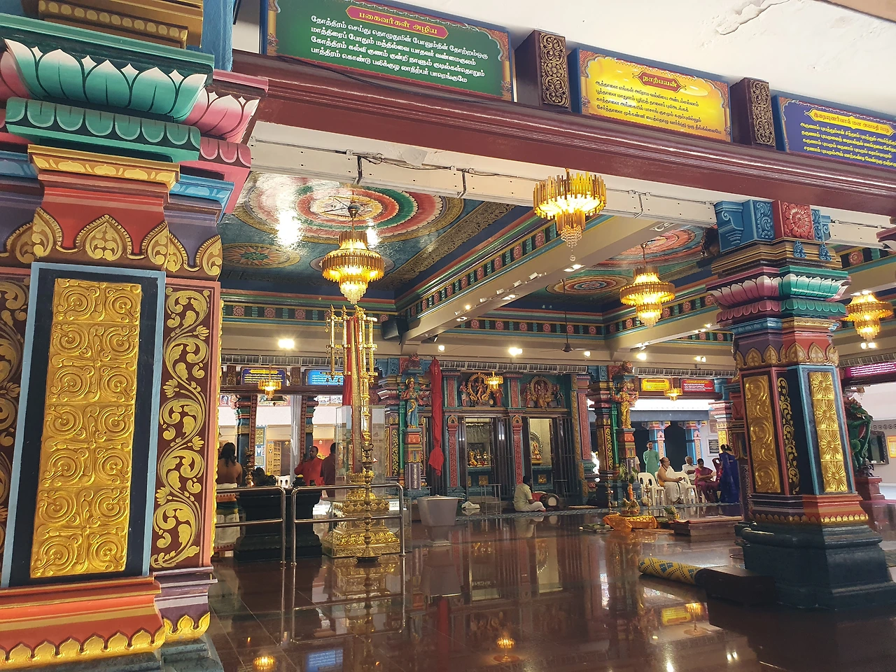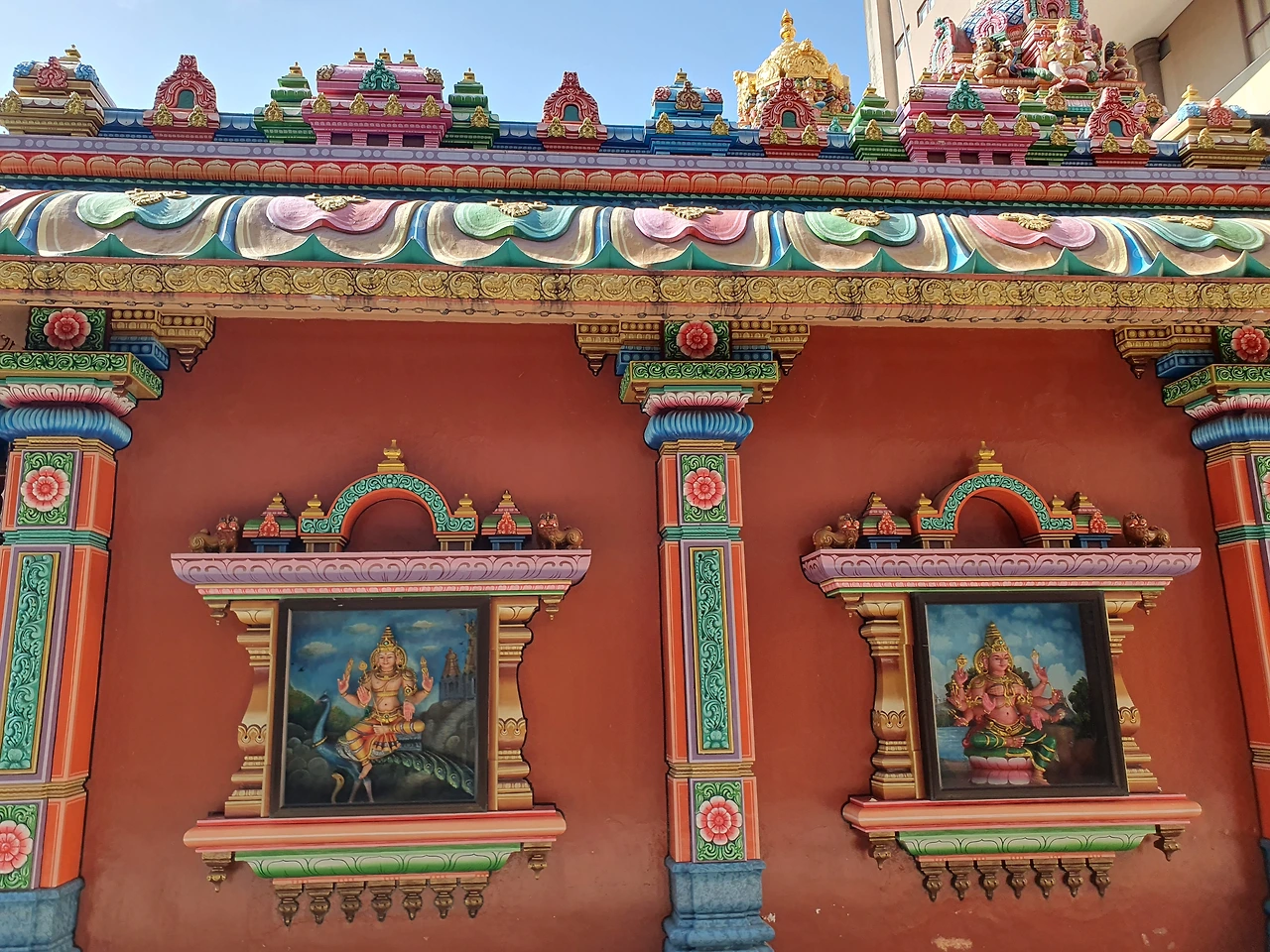 사원의 가장 눈에 띄는 특징은 입구에 자리한 '고푸람'(gopuram)이라고 불리는 높은 탑문입니다. 이 탑은 다채로운 색깔의 힌두 신상 조각들로 장식되어 있어 매우 인상적입니다. 사원 내부에는 힌두교의 주요 여신 중 한 명인 마리암만(Mariamman)을 모시고 있으며, 마리암만은 질병과 재앙을 막아주는 여신으로 믿어집니다.