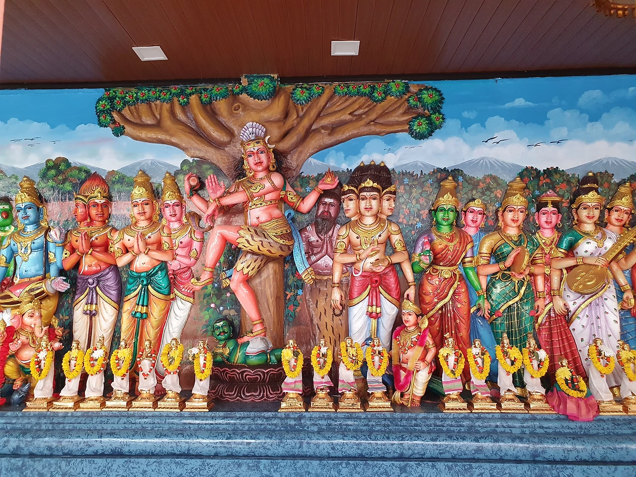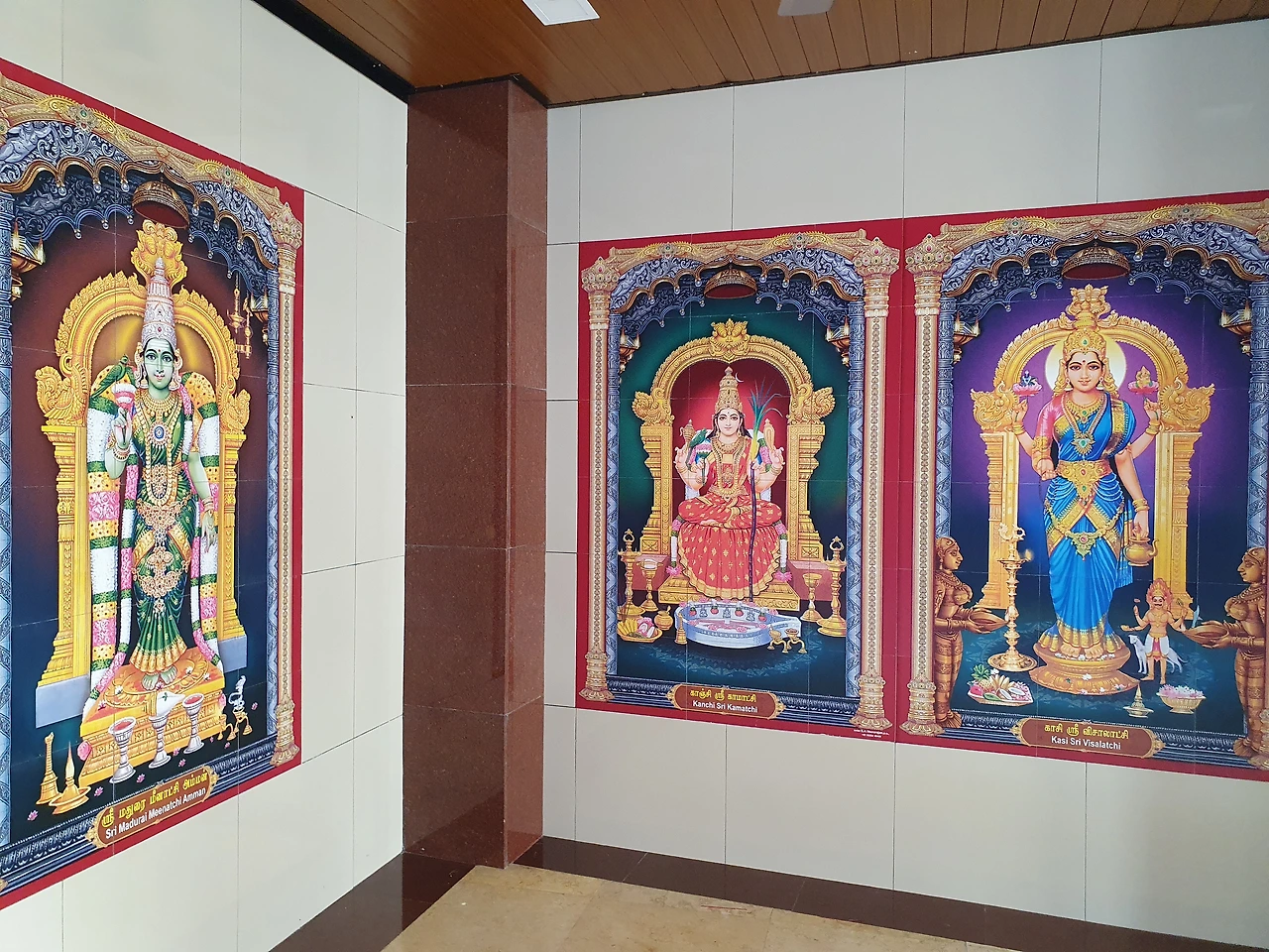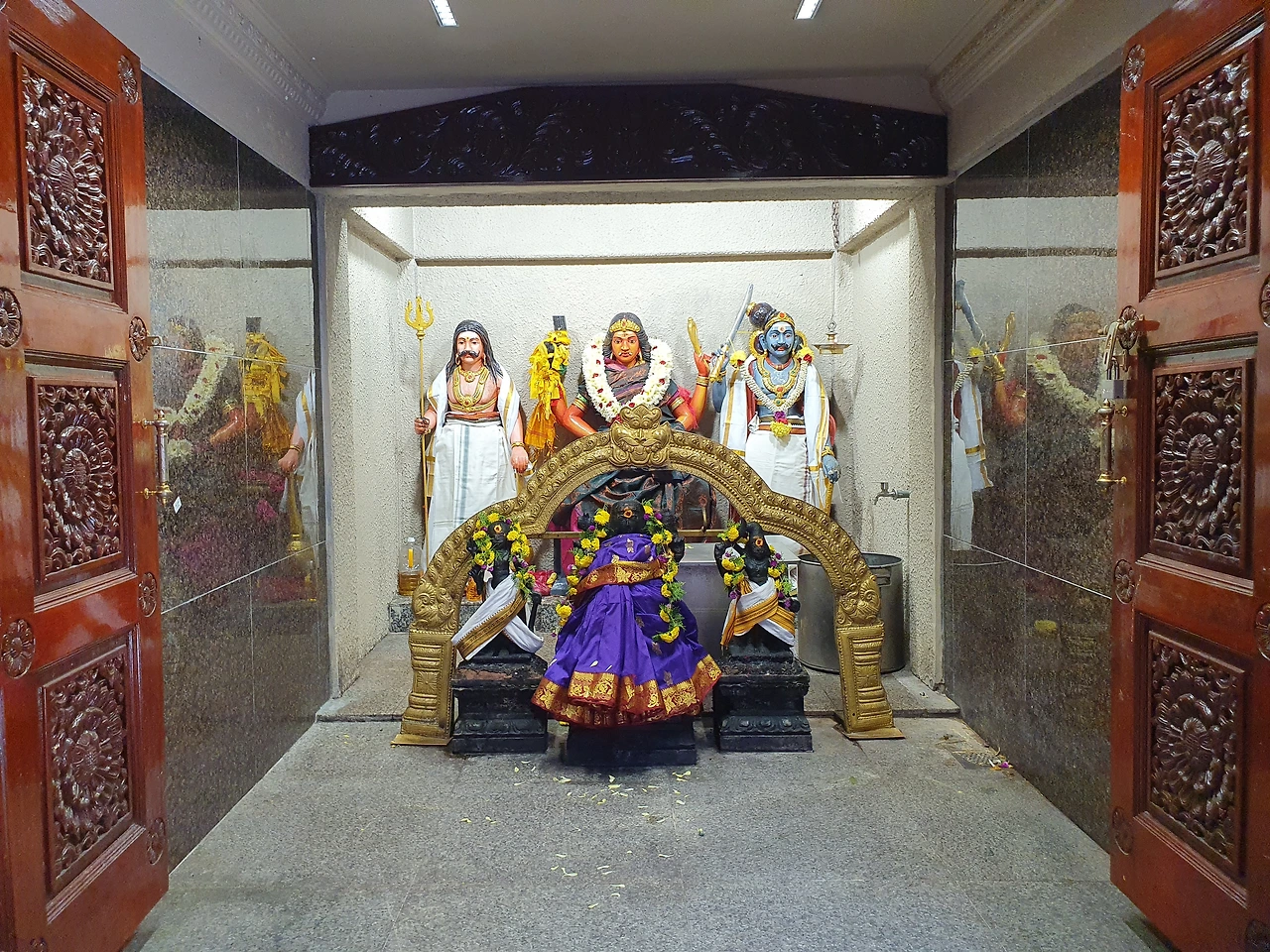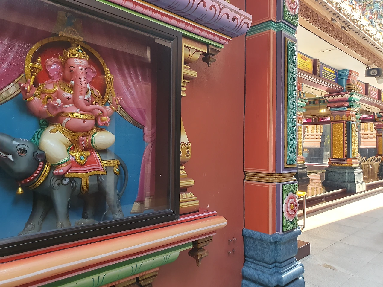 사원의 가장 눈에 띄는 특징은 입구에 자리한 '고푸람'(gopuram)이라고 불리는 높은 탑문입니다. 이 탑은 다채로운 색깔의 힌두 신상 조각들로 장식되어 있어 매우 인상적입니다. 사원 내부에는 힌두교의 주요 여신 중 한 명인 마리암만(Mariamman)을 모시고 있으며, 마리암만은 질병과 재앙을 막아주는 여신으로 믿어집니다.