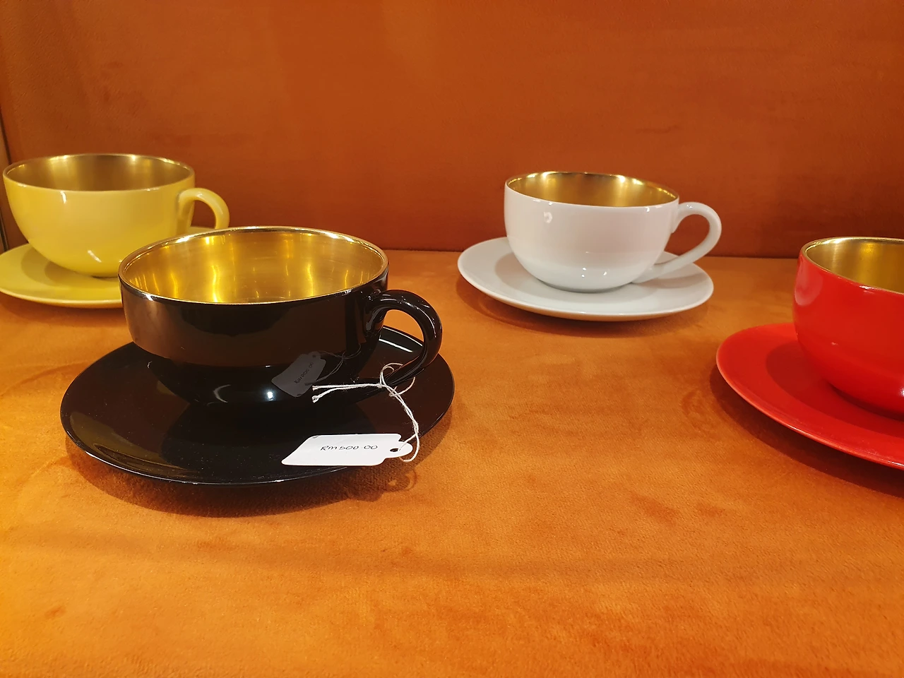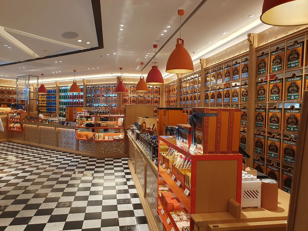 골드와 블루 톤의 화려한 장식과 함께 다양한 커피 용품과 패키지가 매장에 진열되어 있어 감각적인 분위기가 특징입니다.