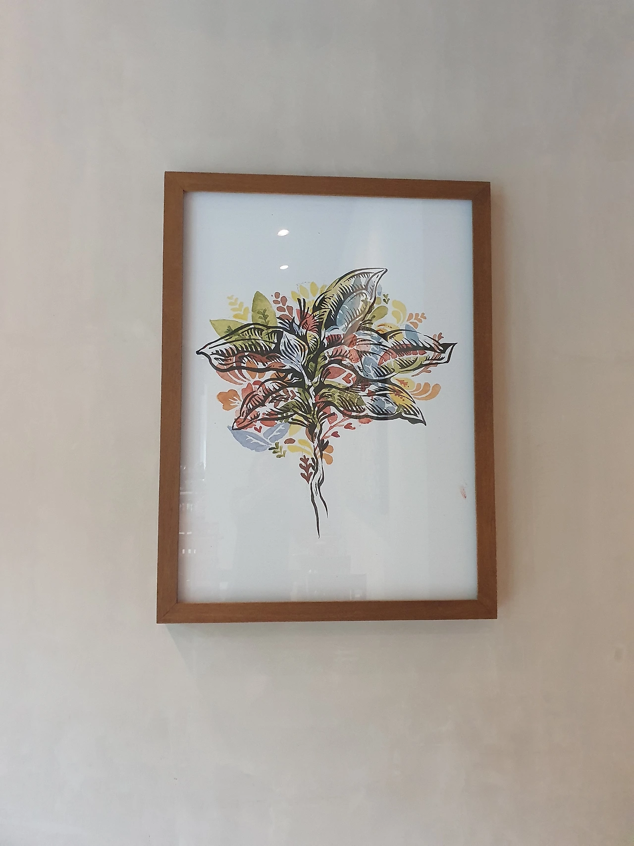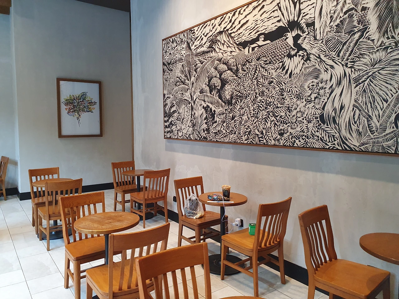 창밖을 바라보며 느긋하게 음료를 즐기고 있으니, 푸른 잎사귀들이 바람에 살랑거리는 모습이 참 평화롭게 다가왔습니다. 카페의 벽에 걸린 말레이시아 특유의 그림들도 참 아름답게 느껴졌습니다.