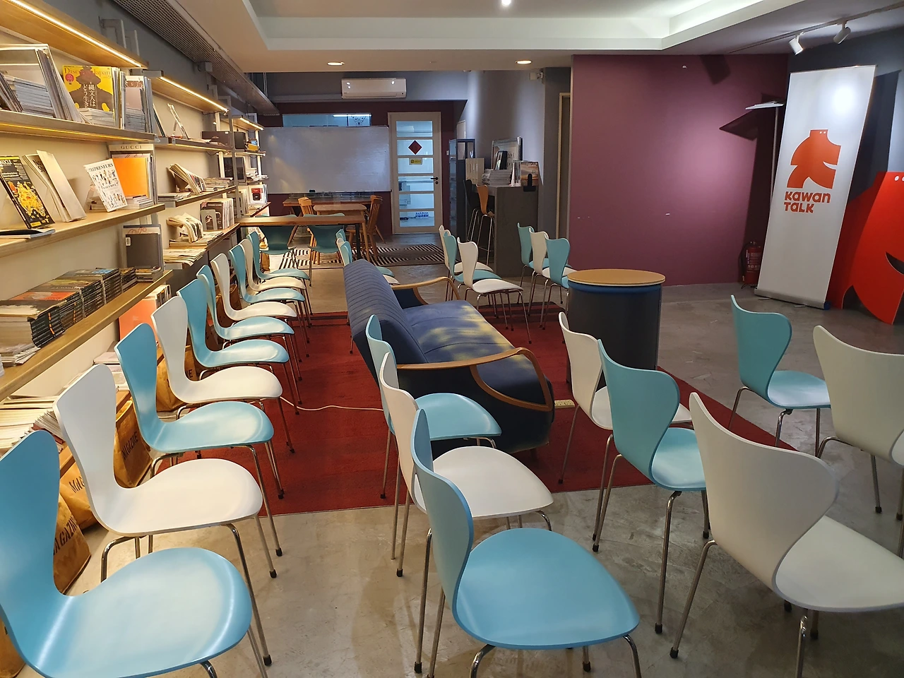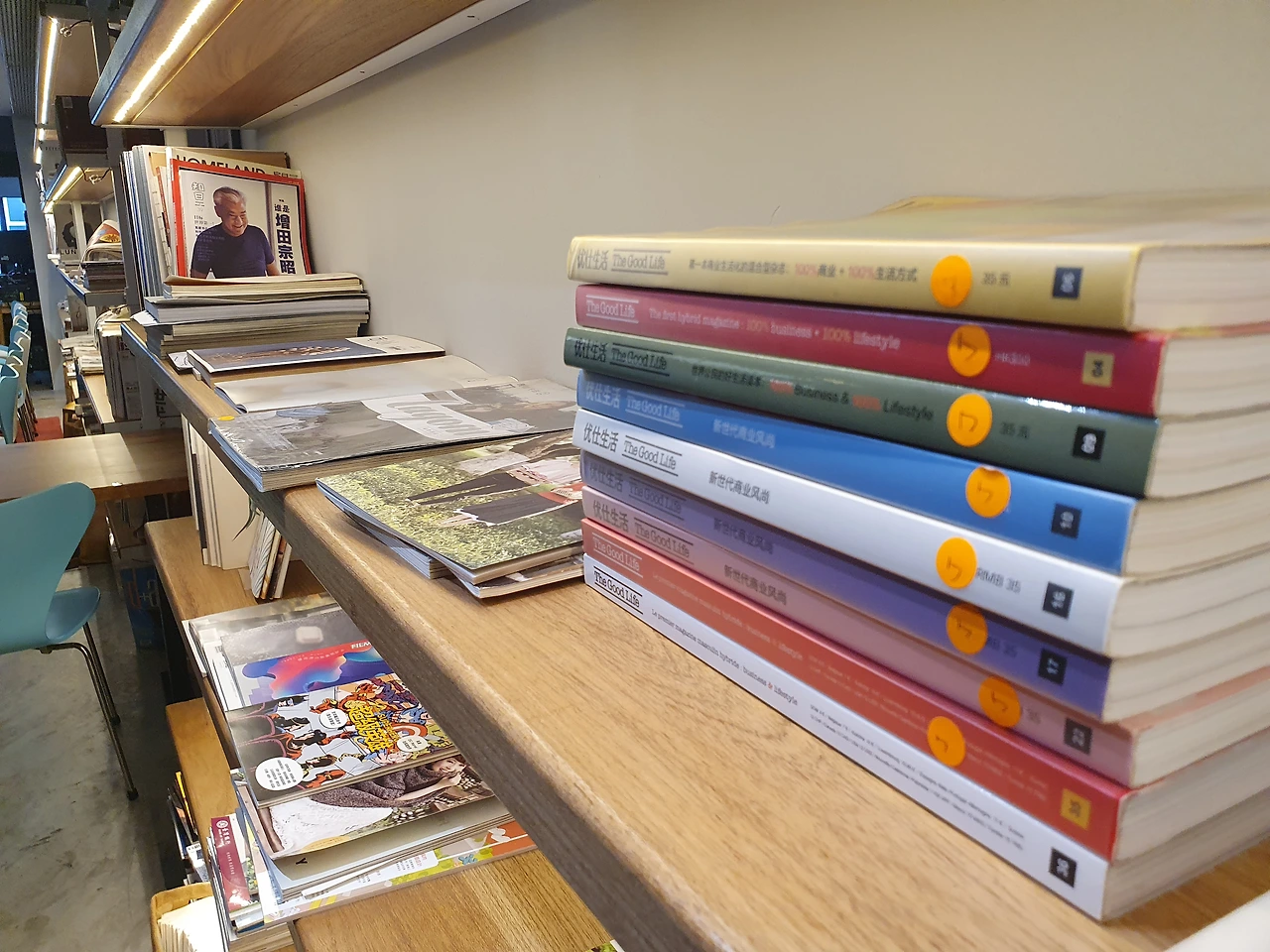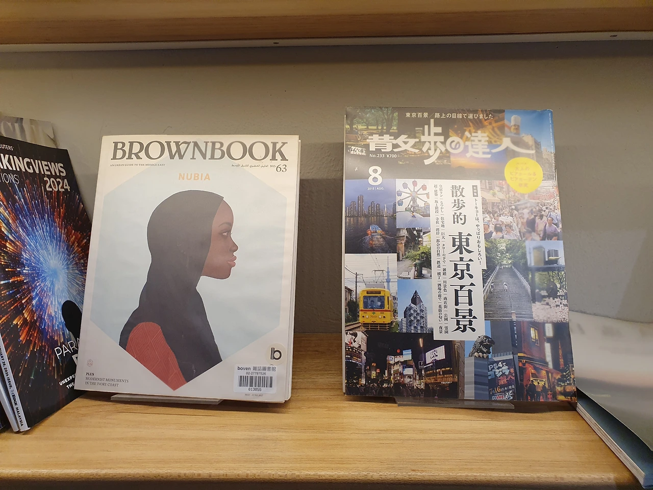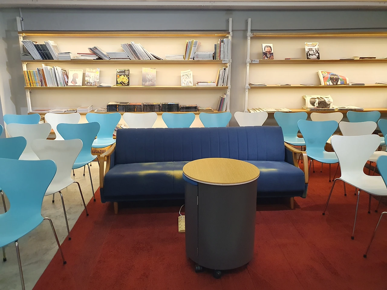입구에 들어서자마자 눈에 띄는 건 벽면을 가득 채운 잡지들. 최신 트렌드부터 클래식한 주제까지 다양한 잡지가 정돈되어 있었고, 감각적으로 배열된 모습이 눈에 들어왔습니다.