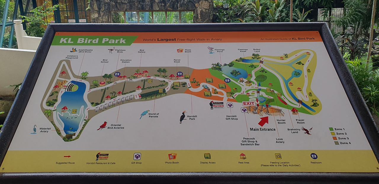 KL 버드 파크는 총 네 개의 주요 구역으로 나뉘어 있습니다.