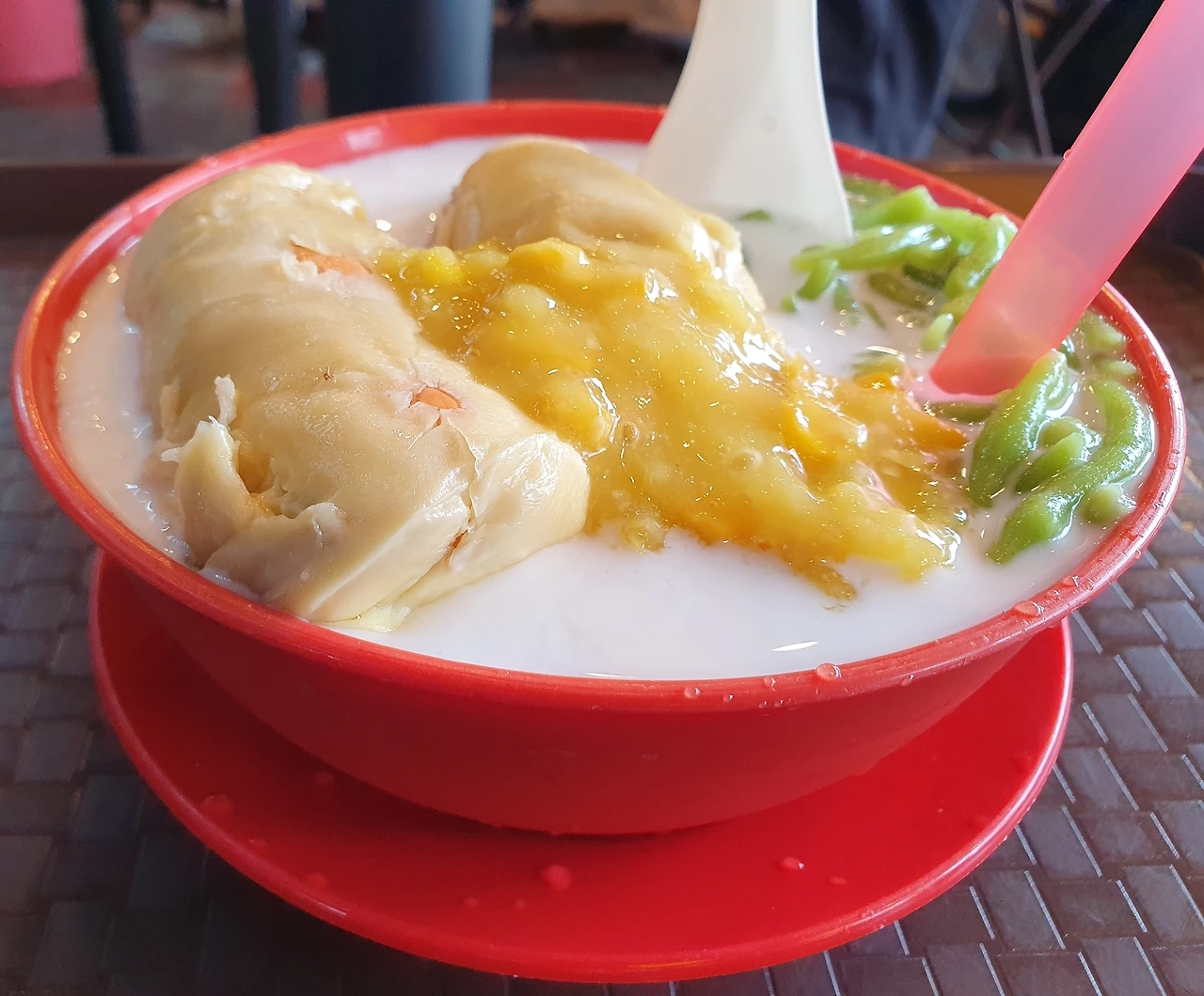 초록빛 첸돌, 고소한 코코넛 밀크, 진한 팜 설탕 시럽이 듬뿍 들어간 그릇 위로 두리안이 자리하자 특유의 향이 은은히 퍼졌습니다.