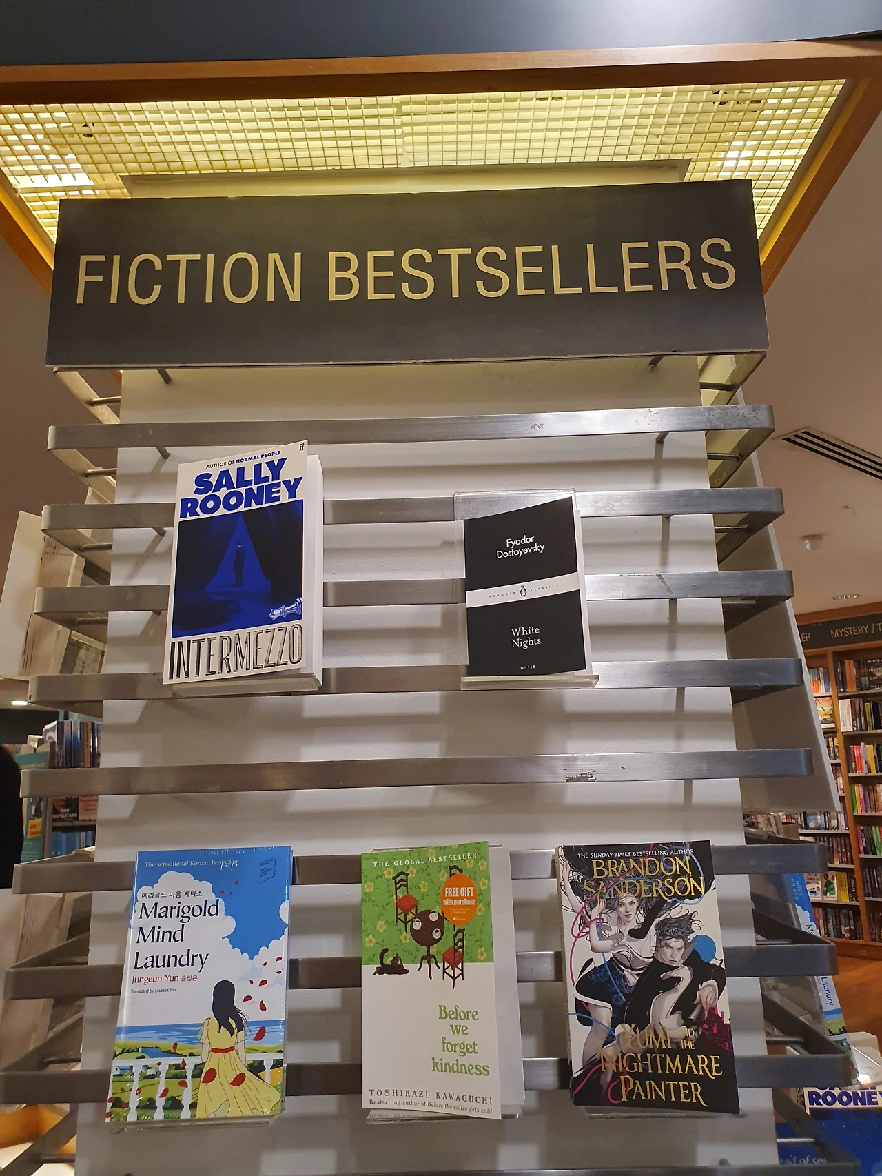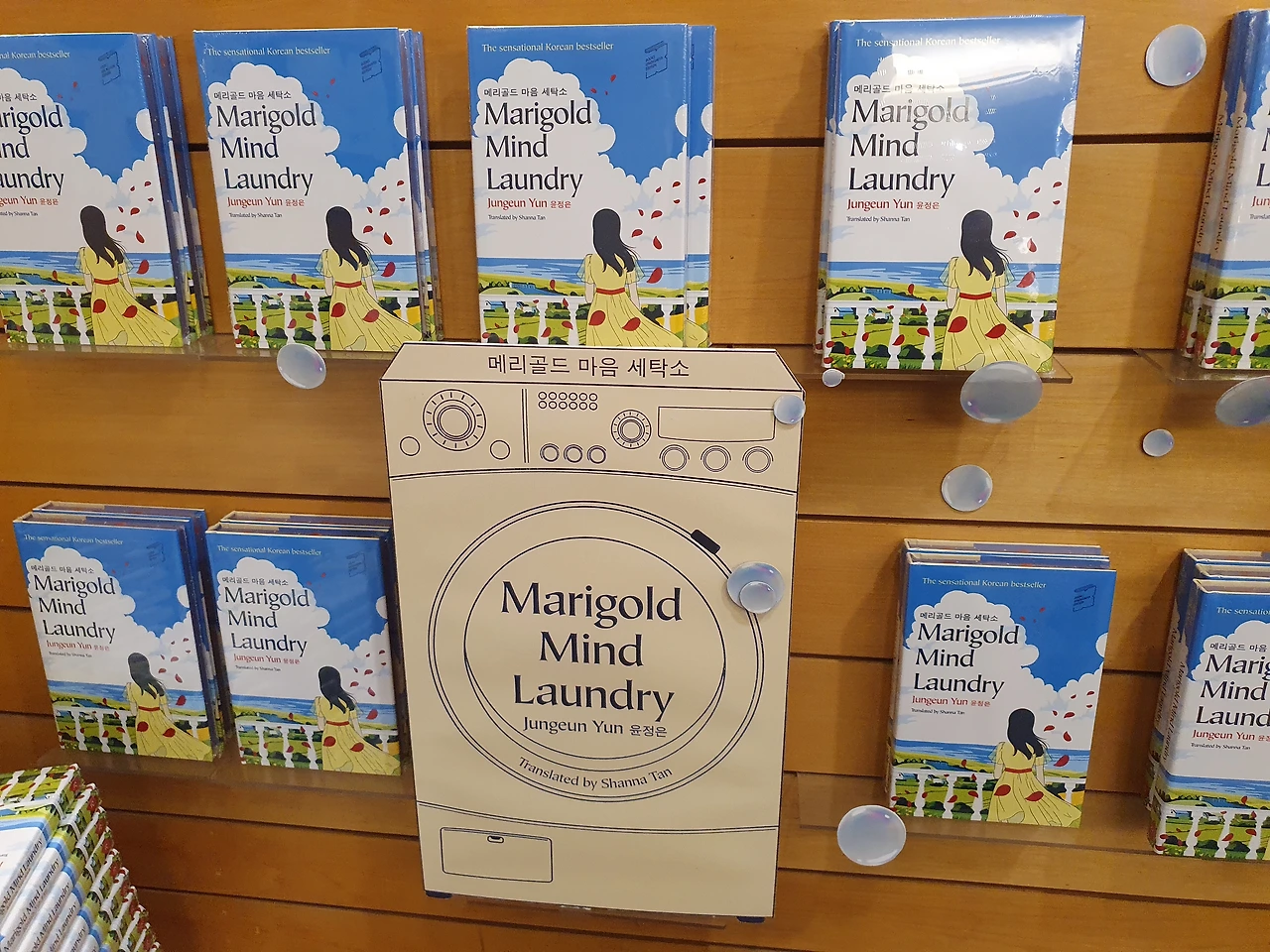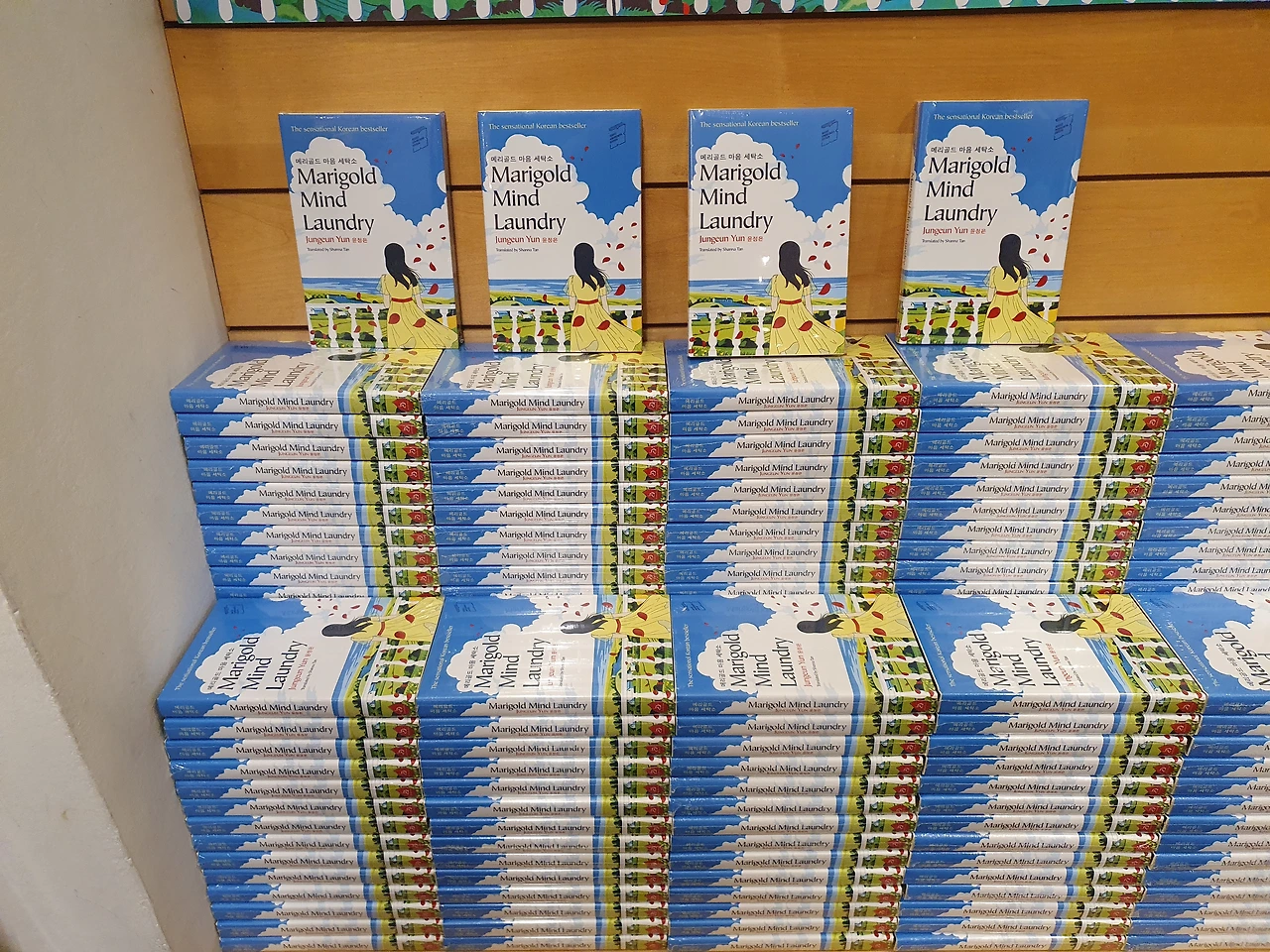 베스트셀러 코너에서 윤정은 작가의 ‘메리골드 마음세탁소’를 발견했습니다. 해외에서 한국작가의 책이 베스트셀러로 자리 잡고 있다는 사실이 기뻤습니다.