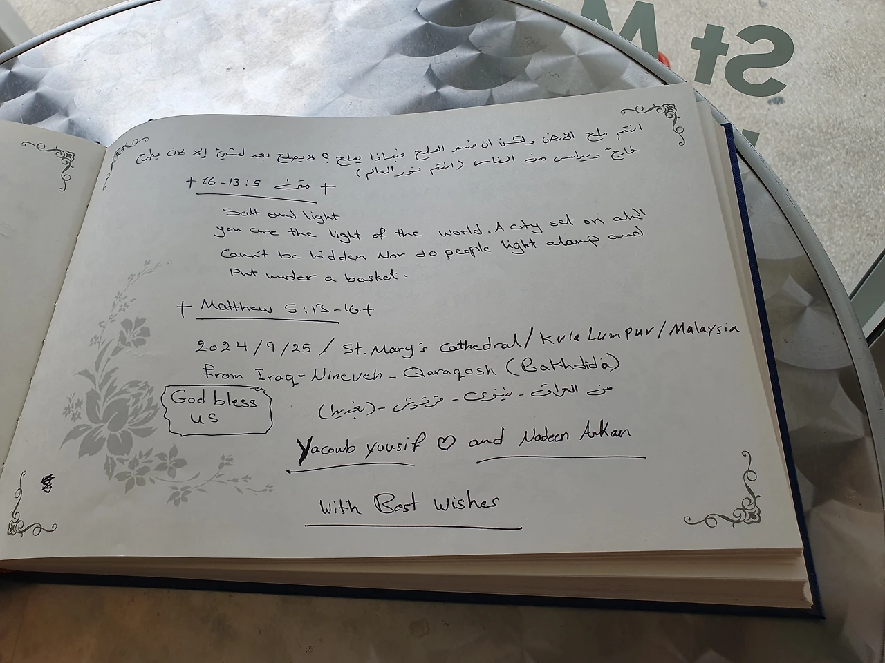 성당 입구를 지나자 눈길을 끈 것은 작고 단정한 파란색 방명록이었습니다. 성당을 찾은 사람들이 남긴 글들이 페이지마다 빼곡히 적혀 있었고, 글자들 사이로 사람들이 느낀 평화와 감사의 마음이 고스란히 전해져 오는 듯했습니다.