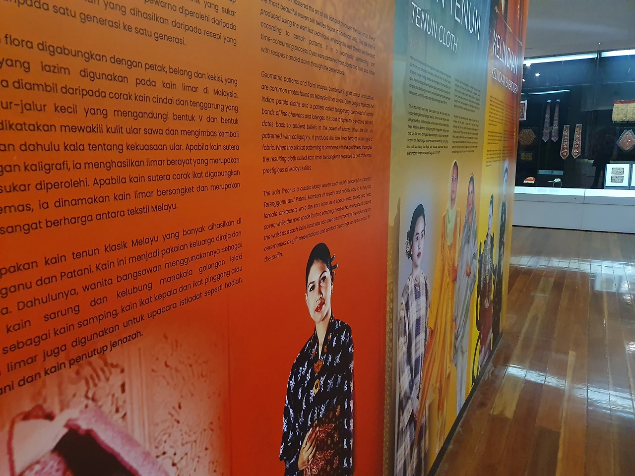 박물관 내부는 말레이시아 전통 직물의 다양한 종류를 소개하는데, 예를 들어 바틱(batik), 송켓(songket), 푸아 쿠부(pua kumbu) 등의 전통 직물이 전시되어 있습니다. 바틱은 왁스를 이용해 천에 무늬를 새긴 후 염색하는 기법으로, 말레이시아와 인도네시아에서 널리 사랑받는 예술 형태입니다. 송켓은 금이나 은의 실을 짜 넣어 화려하게 제작되는 직물이며, 주로 왕실이나 귀족 계층이 입는 옷감으로 사용되었습니다.