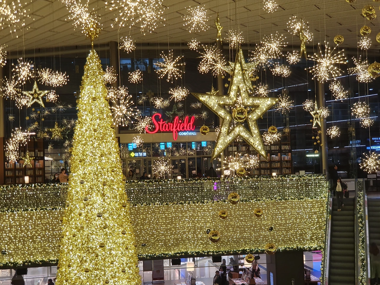 겨울의 별마당 도서관으로 발걸음을 옮겼습니다. 도착하자마자 눈앞에 펼쳐진 풍경은 동화 속 한 장면 같았습니다. 높이 솟은 책장과 공간을 가득 채운 반짝이는 별 장식이 정말 아름다웠습니다. 어두운 밤에 더욱 빛나는 장식은 보는 이의 마음을 설레게 만들 정도로 매력적이었습니다.