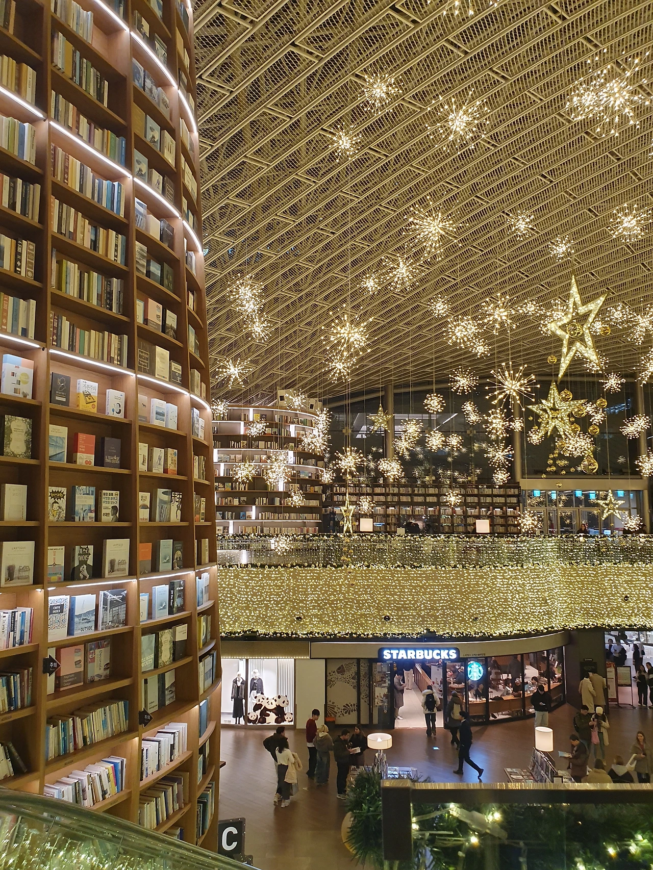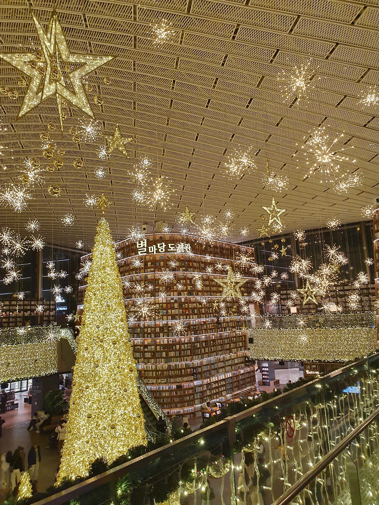사람들이 많다는 건 알고 있었지만, 막상 그 광경을 직접 마주하니 생각보다 더 많은 이들이 도서관을 가득 채우고 있었습니다. 대부분은 사진을 찍거나, 책장을 거닐며 장식의 아름다움을 감상하고 있었습니다. 평소 같았다면 쉽게 지쳤을지도 모르겠지만, 별처럼 빛나는 겨울 장식이 사람들의 북적임마저도 따뜻하게 덮어주는 느낌이 들었습니다.