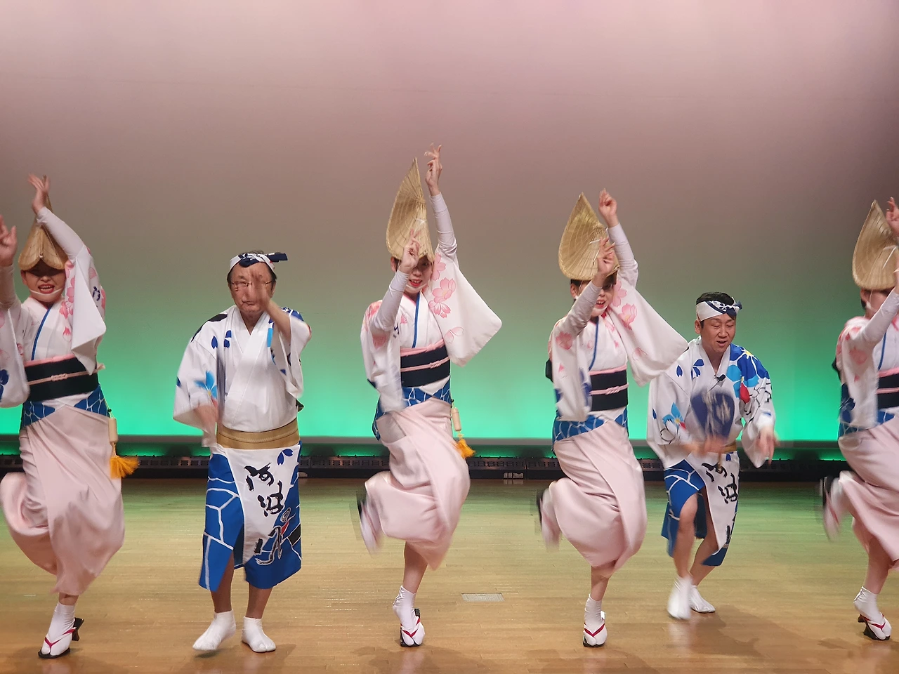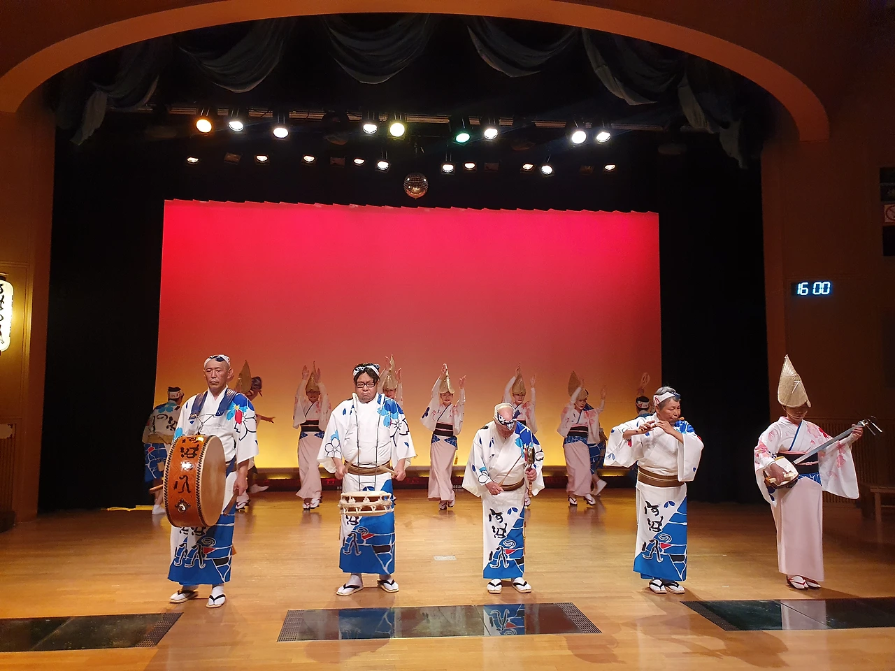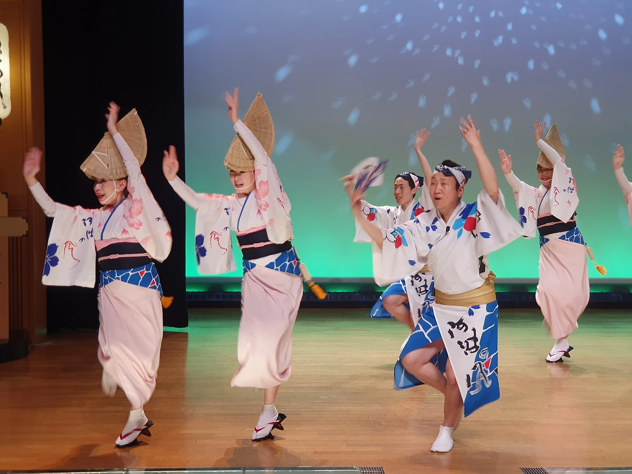 공연이 시작되자, 무대 위로 아와오도리 전문 무용단 ‘렌(連)’이 등장했습니다. 북과 샤미센, 피리 소리가 울려 퍼지며 무용수들의 움직임이 경쾌하게 이어졌습니다.
