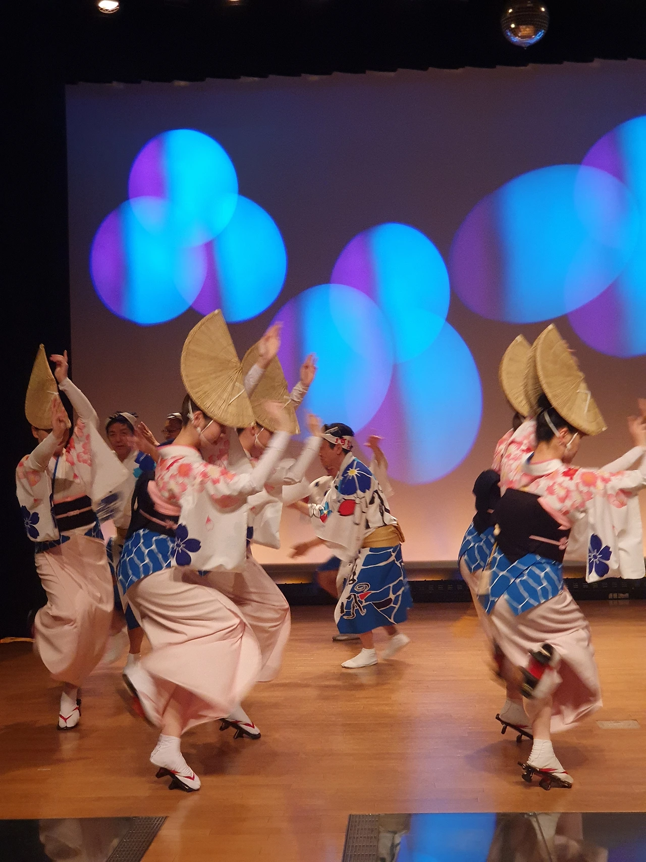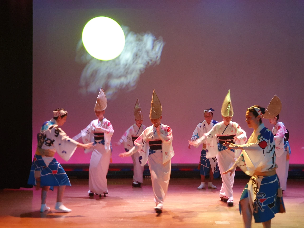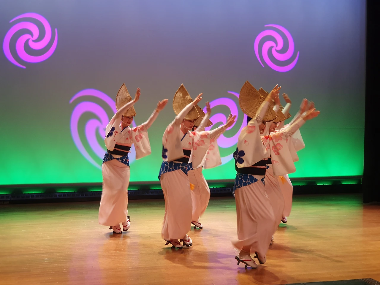 공연이 시작되자, 무대 위로 아와오도리 전문 무용단 ‘렌(連)’이 등장했습니다. 북과 샤미센, 피리 소리가 울려 퍼지며 무용수들의 움직임이 경쾌하게 이어졌습니다.