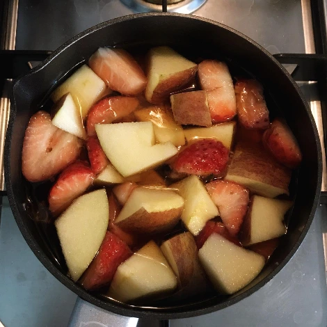 냉장실에 뒹굴뒹굴하는 사과를 꺼냈다. 야금야금 무르기 시작한 딸기도. 사과는 껍질째 작은 주사위 모양으로 썰었다. 딸기는 무른 부분을 도려냈다. ‘에계!’ 이것밖에 안 되네? 손질을 마친 딸기에는 과육이 얼마 안 남았다. 하지만 그 양에 비해 향은 굉장히 진했다. 냄비에 물을 붓고 얼그레이 티백 2개를 넣어서 끓였다. 얼그레이가 한소끔 끓어오르자 티백을 건져냈고 과일을 모두 넣어서 다시 한번 끓였다. 이때 중약~중간 불을 유지했다. 다시 한소끔 끓어올랐을 때 불을 껐다. 오래 끓이면 과일이 물러져서 차가 탁해질 것 같았기 때문이다. 차를 한 김 식힌 후, 티팟에 옮겨 담았다. 때마침 진저 에이드를 마시려고 사둔 로즈메리도 한 줄기 넣었다. 아, 그전에 로즈메리에 약간의 자극, 손바닥 위에 올려놓고 다른 손바닥으로 세게 내리치는 식으로 물리적으로 충격을 줘 그 향을 극대화했다. 함께 먹을 호두 파운드 케이크도 꺼냈다.