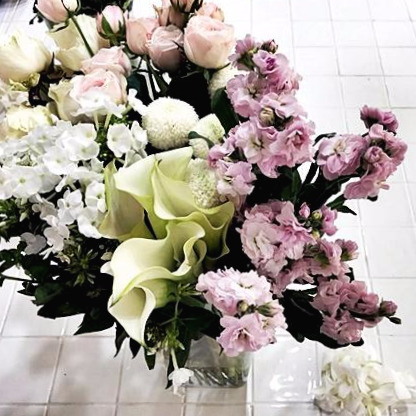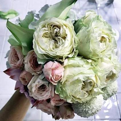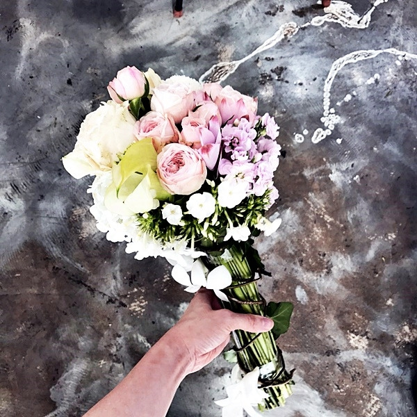 본격적으로 시작하기에 앞서, 오늘 만들 부케의 모습에 대한 자세한 설명이 있었다. 화이트를 메인 컬러로 삼고 곳곳에 핑크를 섞어서 화사하고 우아한 분위기의 신부에게 어울릴법한 스타일로, 전체적으로 마이크를 닮았다고 했다. 꽃이 모 인부분은 공처럼 동그랗고, 줄기는 쭉 뻗은 형태. 단조로움을 피하기 위해 포인트를 주기로 했다. 오늘 사용할 꽃 중, 덴파레는 미리 물을 뿌려 두어 시들시들한 꽃잎을 살린 후 철사로 줄기를 만들었다. 아이비는 물 내림이 심해 마지막에 꺼내기로 했다. 다른 꽃들은 부지런히 컨디셔닝했다. 준비를 마치고 이제 설명대로 꽃을 잡았다. 공 형태의 부케이므로 오늘의 주인공도 얼굴이 동그란 올포러브와 큐피도! 둥근 꽃으로 시작하면 공 형태를 만들기 쉽다는 설명을 따라 올포러브, 큐피도순으로 그루핑했다. 그런 후, 카라, 프록시를 그루핑하고 퐁퐁소국으로 카라의 밑부분을 채우며 그루핑했다. 쿠루쿠마, 스토크도 마찬가지로 그루핑했다. 하는 도중, 내 실력이 미심쩍어 요리보고 조리 보니 가관이었다. 공 형태는커녕 꽃들이 들쭉날쭉, 심지어 움푹 파인 부분도 있었다. 말 그대로 총체적 난국이었다. 공 형태를 유지하면서 스파이럴까지 하려니 벅찼나 보다. 처참한 광경에 얼굴에 흙빛이 드리워졌는지 선생님이 다가와 “이럴 땐, 과감하게 처음부터 다시 하는 게 속 편해요.”라며 나를 대신해 꽃을 해체해주었다. 그리고 올포러브와 큐피도, 카라와 프록시로 공 모양의 기본 틀을 만들어주었다. 선생님의 심폐 소생 덕분에 공 형태를 만드는 데 성공했다. 그런 후, 스파이럴로 모아진 줄기를 살짝 돌려 페럴렐 형태로 바꾸고 테이프로 둘레를 고정했다. 가위로 줄기 끝을 정돈하고 아이비를 대각선으로 둘렀다. 길쭉한 줄기 부분에 덴파레로 포인트를 주는 것으로 부케를 완성했다.