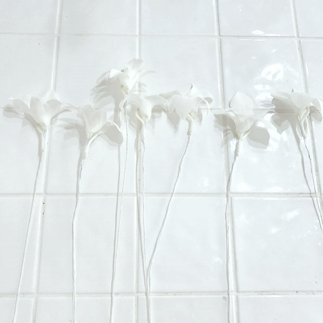 덴파레를 줄기에 꽂은 것처럼 핀을 사용하여 꽃을 고정시키는 방법.