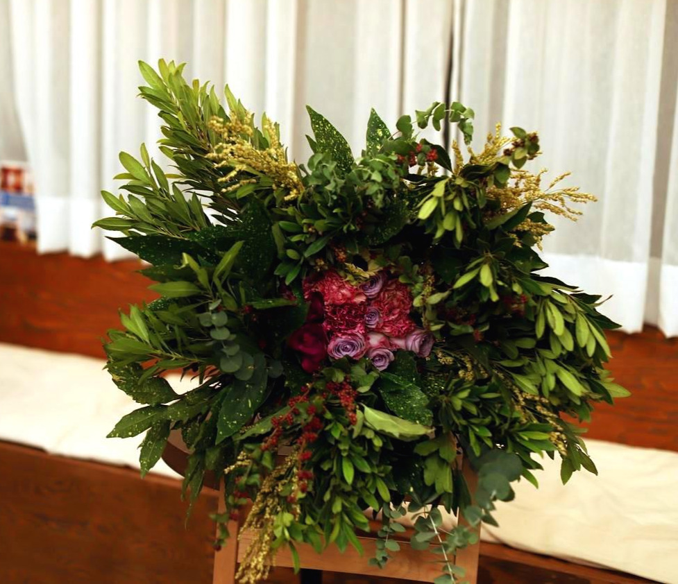 | 퍼플헤이즈, 쿠루쿠마, 카네이션, 해바라기를 평평하게 그루핑한 후, 레드베리, 수수, 청목, 서귀, 유칼립투스로 감싸듯이 작업하여 완성.