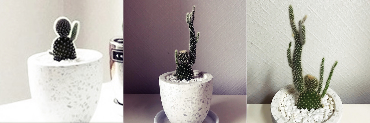 시간이 흐르면서 백도선 선인장에 자구가 나는 모습을 사진으로 남겼다. 맨 왼쪽이 처음 집에 왔을 때, 팔을 들고 '저요!'하고 발표하는 형태. 오른쪽으로 갈수록 자구는 점점 길어지는 것은 물론, 예상 밖의 자리에서 존재감을 뽐내고 있는 것을 볼 수 있다. 조금 기괴해 보일지라도 내 눈에는 귀엽고 사랑스럽기만 하다. 그리고 자구가 생겨날 때마다 놀랍고 기쁘다. 서프라이즈 선물을 받았을 때처럼.