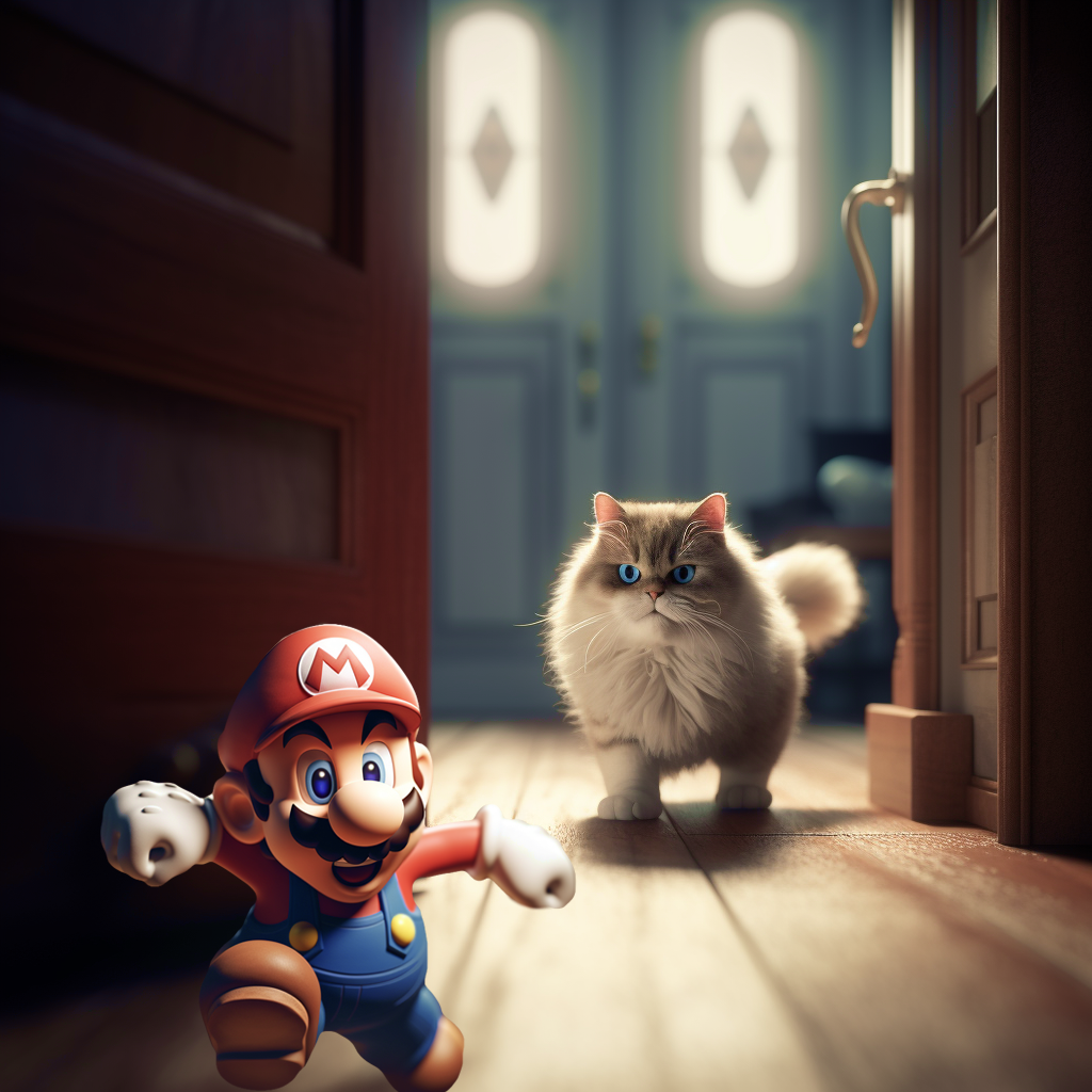 오늘만 해도 슈퍼마리오를 쫒는 고양이 그림을 뽑고 싶었는데 잘 되지 않았다. 슈퍼마리오는 3d render의 느낌을 내고 싶었고, 고양이는 실제 고양이 사진 같은 느낌을 원했는데 묘사를 하는데서 뭔가 잘못 전달이 된 것 같다. 그래서 결국 photoshop으로 둘을 합성하기로 했는데...