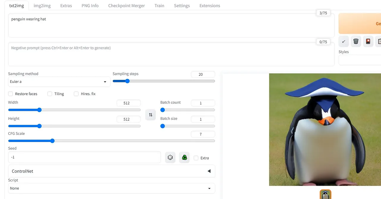 사진에서 볼 수 있다시피 1.5v에 deforum은 없었다. deforum은 또 다른 개발자가 stable diffusion 오픈 소스를 가지고 만든 모드 중에 하나여서 따로 깔아야 했던 것이다. 약간 실망스러웠지만 구동을 한 김에 txt2img를 활용해 모자를 쓴 펭귄을 하나 만들어 봤다.