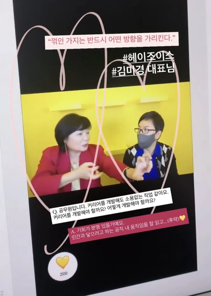 커리어 개발 강의를 참 많이 들으러 다녔다. 혹시 그곳에 답이 있을까봐. 헤이조이스 김미경 강사님 특강 때 질문을 남기기도 했다. “(그 당시)26살 공무원인데 이직이 어렵습니다. 자기계발을 해야 할 이유를 못 찾겠습니다. 어떻게 할까요?”라는 막연한 질문을 던졌다. 이나리 헤이조이스 대표님은 “26살이면 저희가 보기에는 너무너무 어린 나이인데 말이죠…ㅎㅎ” 라고 말씀해주셨고 김미경 대표님은 “민간과 닿으려는 공직 내 움직임을 잘 읽고 내부에서 열리는 교육이 정말 많을텐데 그 기 회를 잡기 위해 부지런히 움직여 보라.”라고 말씀해주셨다.