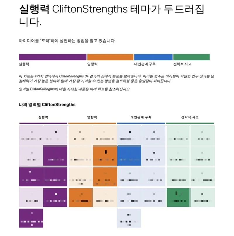 코칭을 받지 않았다면 top5 결과로도 만족했을 것 같다. 해석 리포트를 읽어보면 강점 하나하나를 굉장히 입체적으로 설명해주는데, 상위 5가지 강점에 대한 설명만으로도 인사이트를 많이 얻을 수 있다고 본다.