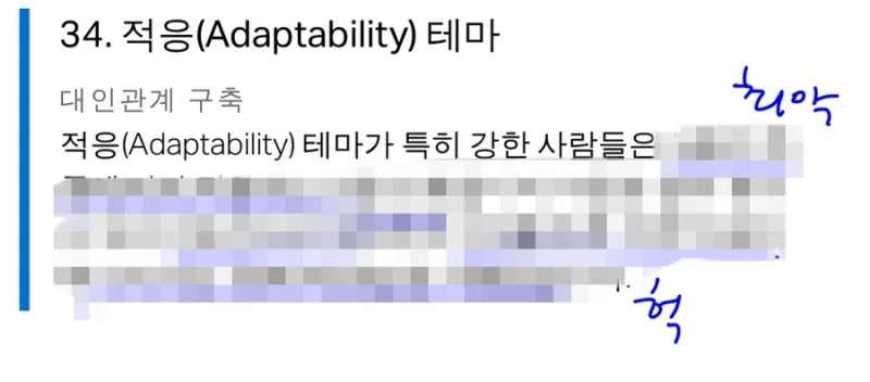 정말 웃긴 건 11위~34위 테마다. 레포트 뒷부분에 ‘나의 CliftonStrenths 34 테마 서열’ 이라고 해서 강점 테마별로 짤막한 설명이 나오는 구간이 있다. 강점 별 설명을 찬찬히 읽으면서 공감이 가는 부분을 밑줄을 치려고 했는데 읽다보니 15번 자기 확신 테마부터는 밑줄이 아니라 취소선을 긋거나 엑스표를 치거나 ‘그닥…?’ 이라고 쓰거나 ‘노관심…’ 이라고 쓰고 있었다.