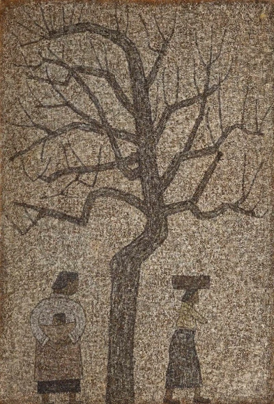 나무 옆을 두 여인이, 아기를 업은 한 여인은 서성대고 짐을 인 한 여인은 총총히 지나가고 있었다.