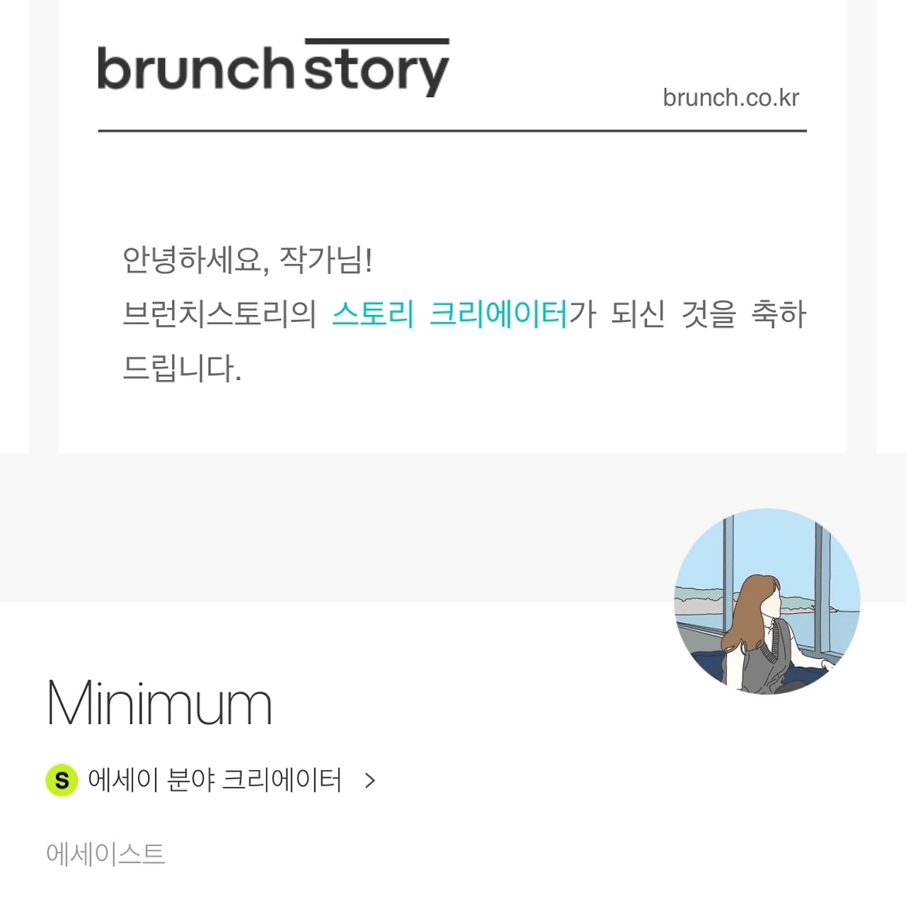 오정세 배우가 수상소감에서 말했던 동백이가 저에게 찾아와 준 느낌입니다. 헤밍웨이, 하루키, 김연수 작가처럼 더욱더 열심히 운동하고 더욱더 열심히 읽고 보고 생각해서 몸도 마음도 건강한 작가가 되겠습니다.. 소박할지언정 진실한 의미를 실은 Minimum만의 글을 하루하루 성실하게 쓰겠습니다. 진심으로 감사드립니다!