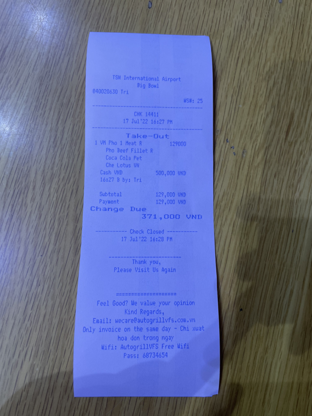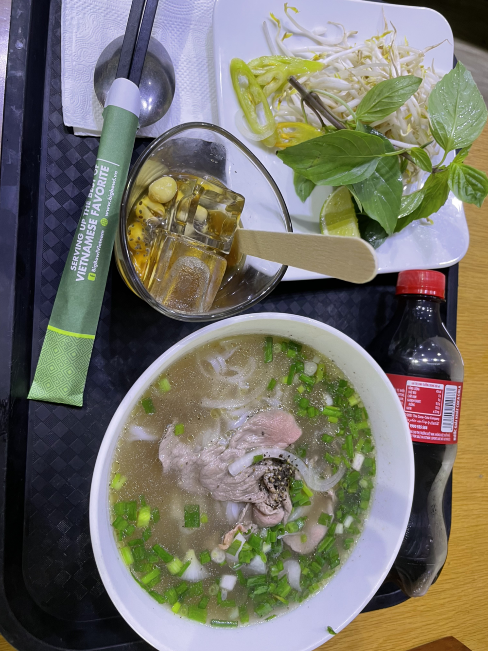 4시간 20분이 걸려 호치민 공항에 도착했다. 생각보다 호치민 공항은 작았다. 나와서 출입국 심사를 받으려 기다리는데만 1시간 30분 정도를 소비했다. 사람도 많고 심사도 매우 느려서 그런 것 같다. 그러고 나왔더니 거의 5시 30분이 다 됐다. 11시 50분쯤 출발했으니까 지금쯤 배고플 시간이 다 된 것이다. 버스를 타러 가기 전, 어떻게 버스를 탈 것인지 좀 보기도 할 겸 나와서 바로 있는 Big Bowl에 가서 포와 무슨 음료수 콤보를 시켰다. 점원한테 어떤게 가장 잘나가고 물어봤는데 제일 비싼 콤보를 말하길래 그냥 제일 저렴하고 기본인 것 같은 1번을 시켰다. 순간 장사를 위한 권모술수는 아닌지 라는 생각이 잠깐 스쳐지나갔다. 포는 생각보다 맛있었다. 배가 고파서 그런지, 양도 그렇게 많아 보이지 않았다. 같이 나온 음료수는 이름이 뭔지는 모르겠으나, 용과의 씨 같은 것이 들어있고 장아찌 같이 생긴 것으 들어 있는데 달짝지근하니 소화에 좋아 보인 듯했다. 점원한테 이거 뭐냐고 물어보니까 왜 알맹이들을 다 먹지 않았냐고 혼이 났다. 몸에 좋다고 다 마시라고 하는데, 생전 보지도 못한 음료를 몸에 좋다고 다 마셨다가 혹여 여행 첫날에 배탈이 나기라도 하면 남은 여행 일정에 차질이 생기기 때문에 조금만 마셨다.