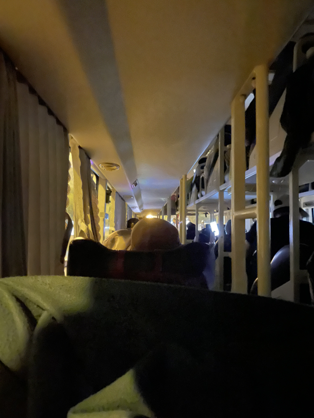 드디어 풍짱 버스에 입성했다. 나는 에이열에 배정되었는데 1층이였다. 들어갈 땐 제공하는 비닐봉지에 신발을 담고 가지고 타야한다. 좌석에 보면 담요도 있는데 남들이 덮던 담요라 찜찜할 수 있으나 나는 여벌의 옷을 가지고 오지 않아 그냥 덮었다. 생각보다 부들부들 보온력이 좋았다.