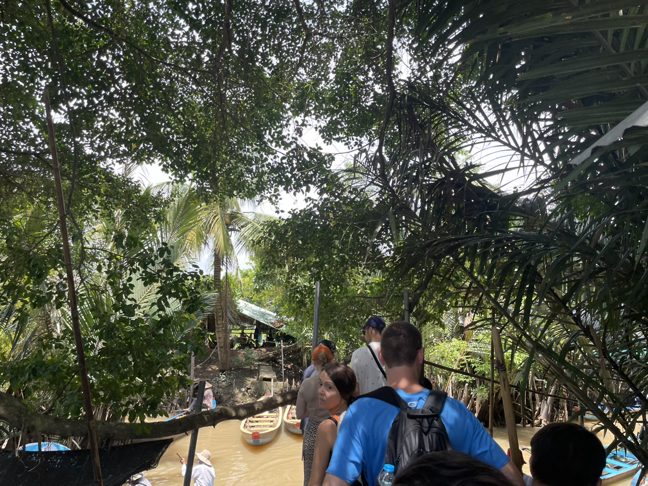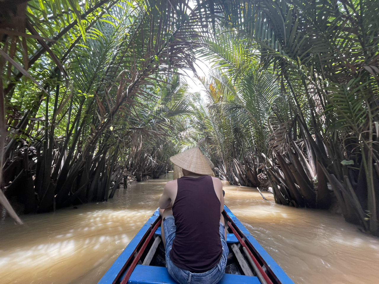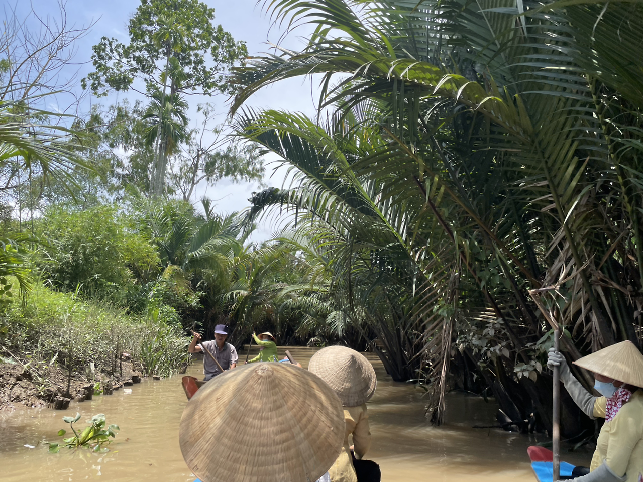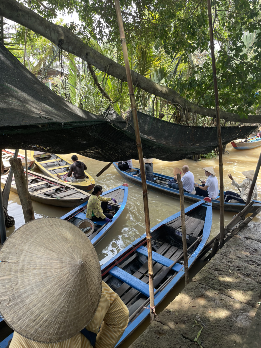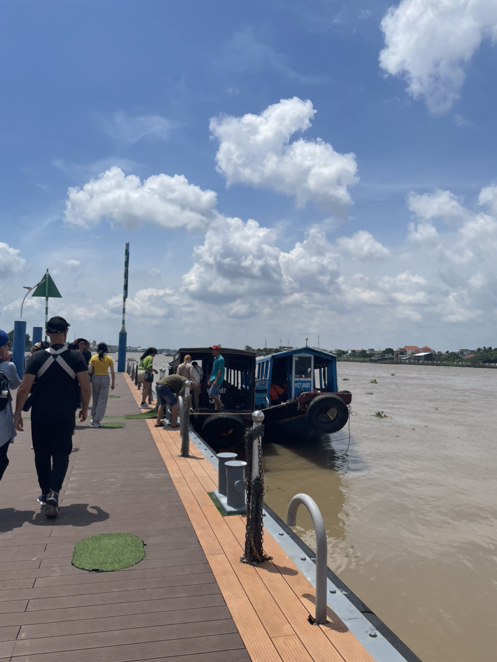 맛있는 열대과일을 먹고 나서 골프 캐디 카트 같은 차를 타고서 몇분 달리고 나니 도착한 곳. 광고로 많이 봤던 메콩강 투어의 묘미. 영상을 찍을 생각에 신이났다. 메콩강에는 물뱀이 많이 산다고 한다. 악어와 위험한 뱀들은 이젠 다 없다고 한다. 아마 인간이 영역을 넓힘과 동시에 점점 서식지를 잃고 사람들의 발자취가 닿지 않는 더욱 더 깊숙한 메콩강으로 잠적을 감춘 것은 아닐까 싶다.