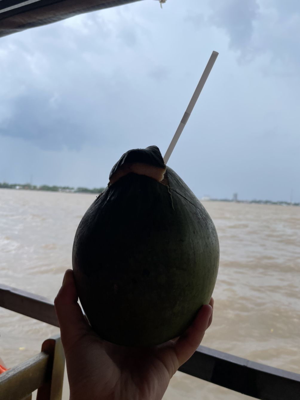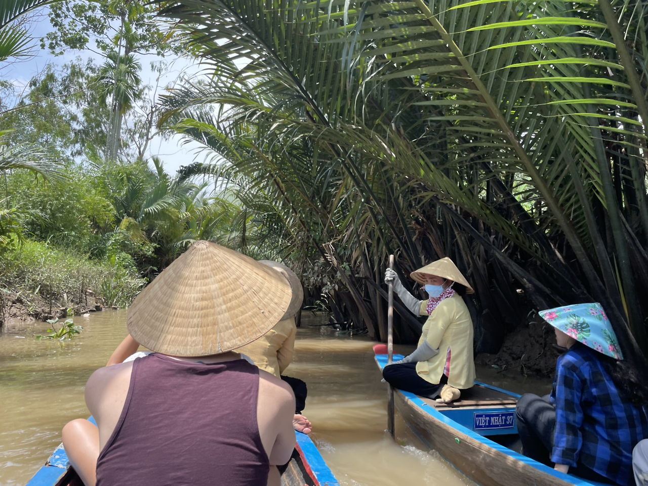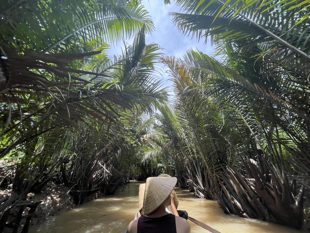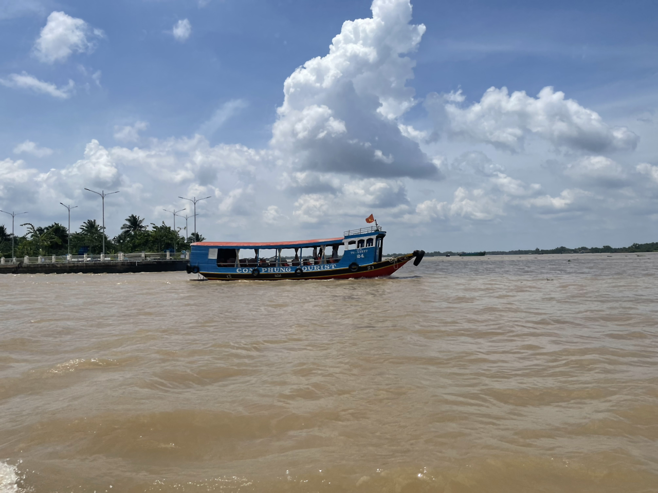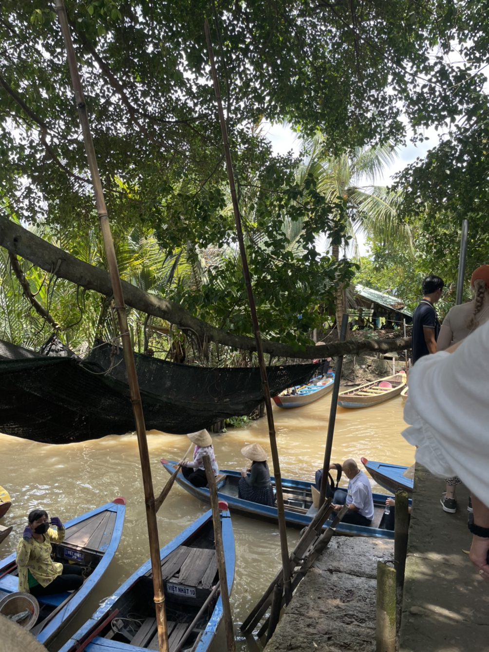 맛있는 열대과일을 먹고 나서 골프 캐디 카트 같은 차를 타고서 몇분 달리고 나니 도착한 곳. 광고로 많이 봤던 메콩강 투어의 묘미. 영상을 찍을 생각에 신이났다. 메콩강에는 물뱀이 많이 산다고 한다. 악어와 위험한 뱀들은 이젠 다 없다고 한다. 아마 인간이 영역을 넓힘과 동시에 점점 서식지를 잃고 사람들의 발자취가 닿지 않는 더욱 더 깊숙한 메콩강으로 잠적을 감춘 것은 아닐까 싶다.