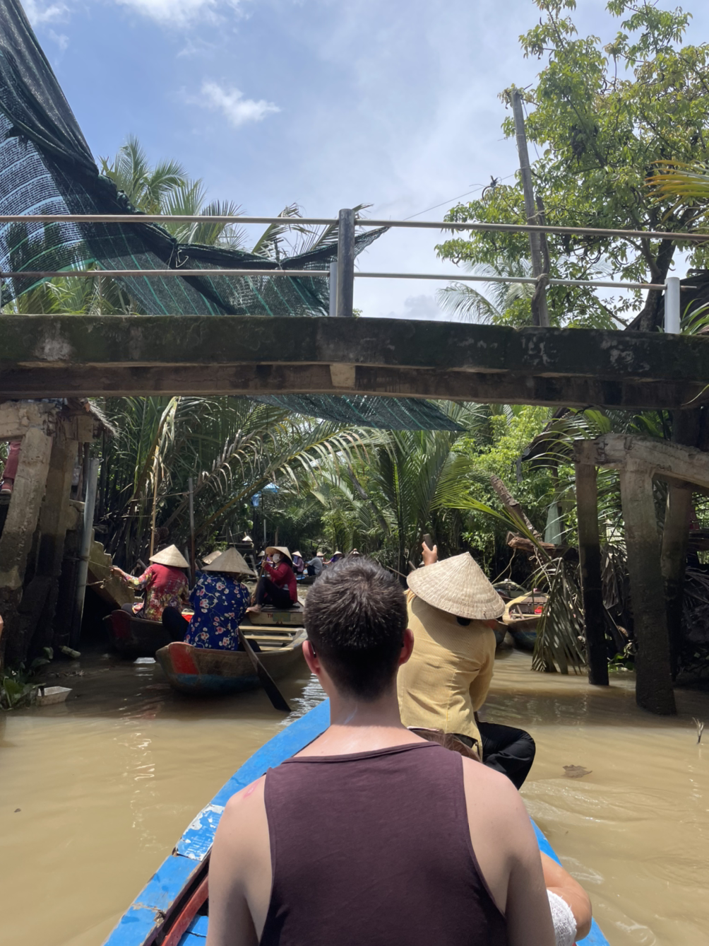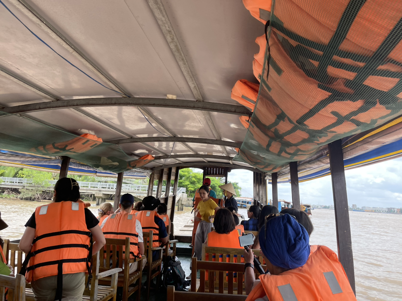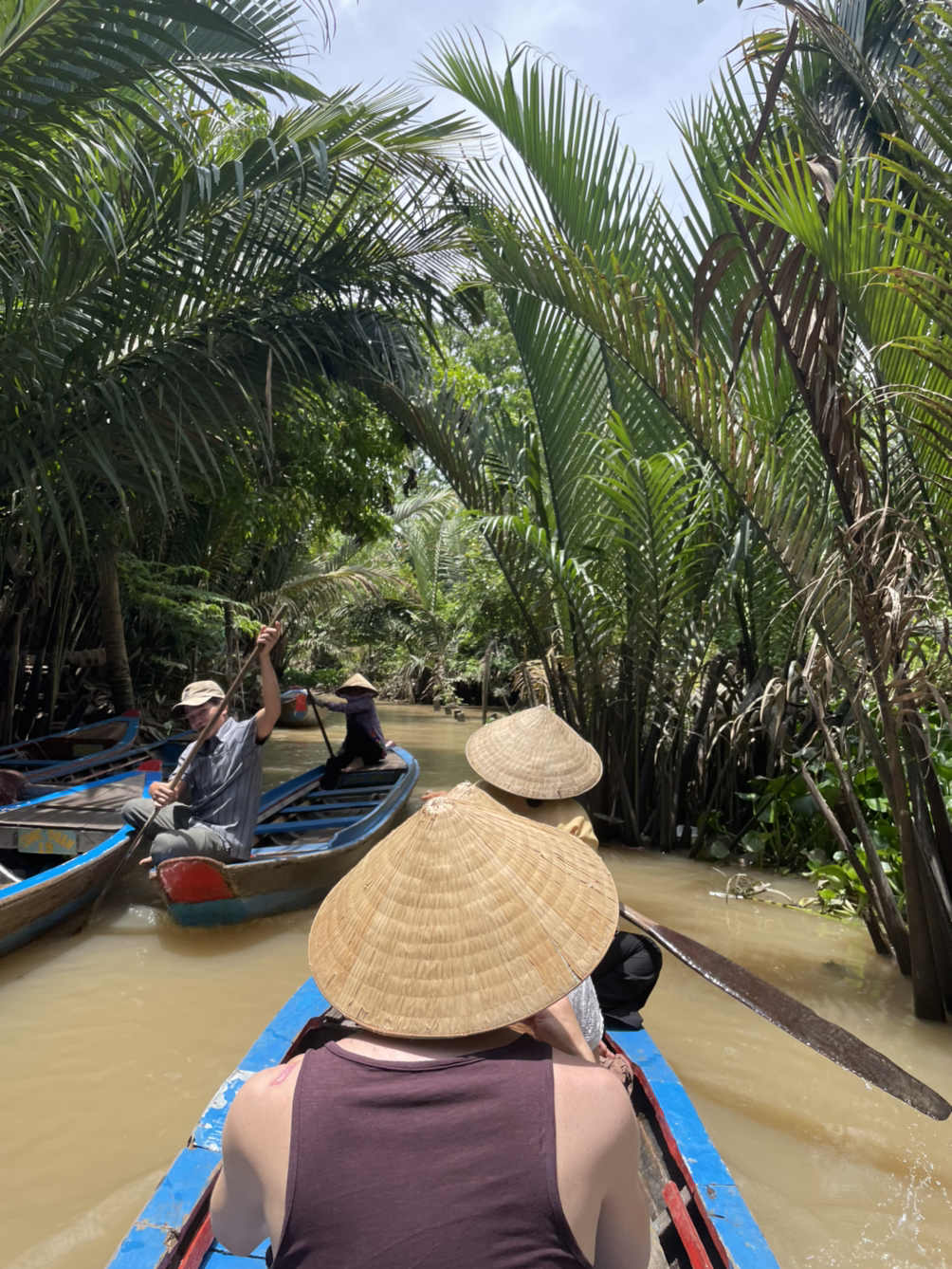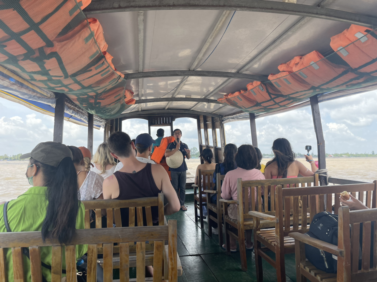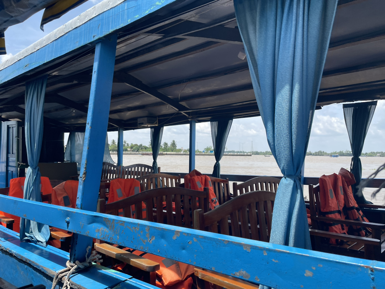맛있는 열대과일을 먹고 나서 골프 캐디 카트 같은 차를 타고서 몇분 달리고 나니 도착한 곳. 광고로 많이 봤던 메콩강 투어의 묘미. 영상을 찍을 생각에 신이났다. 메콩강에는 물뱀이 많이 산다고 한다. 악어와 위험한 뱀들은 이젠 다 없다고 한다. 아마 인간이 영역을 넓힘과 동시에 점점 서식지를 잃고 사람들의 발자취가 닿지 않는 더욱 더 깊숙한 메콩강으로 잠적을 감춘 것은 아닐까 싶다.