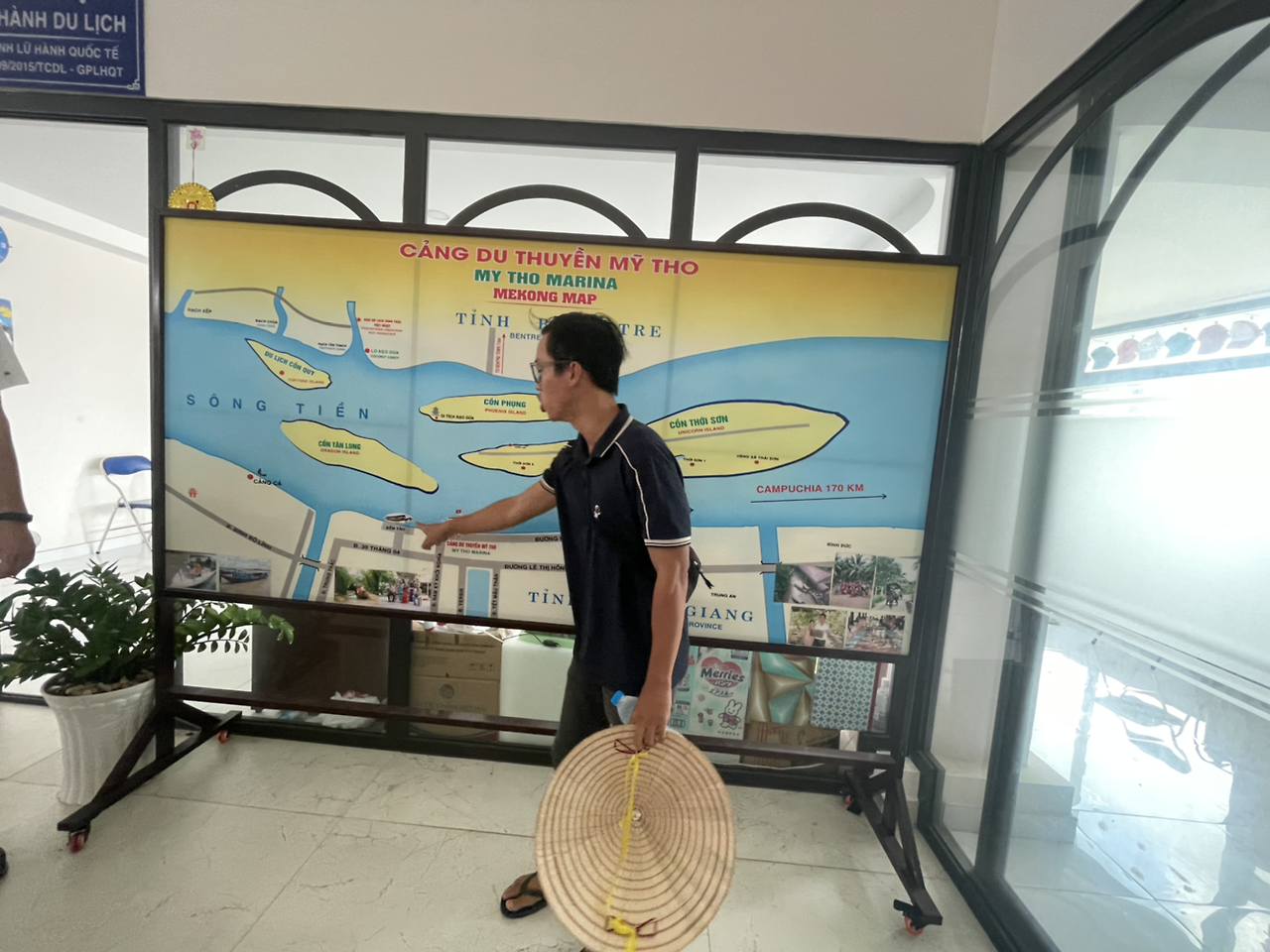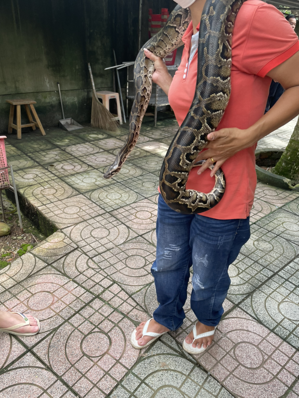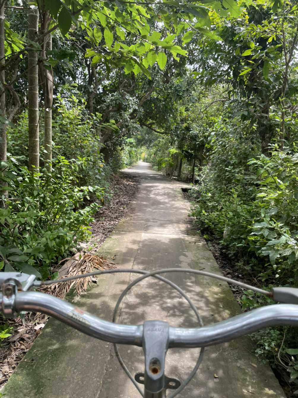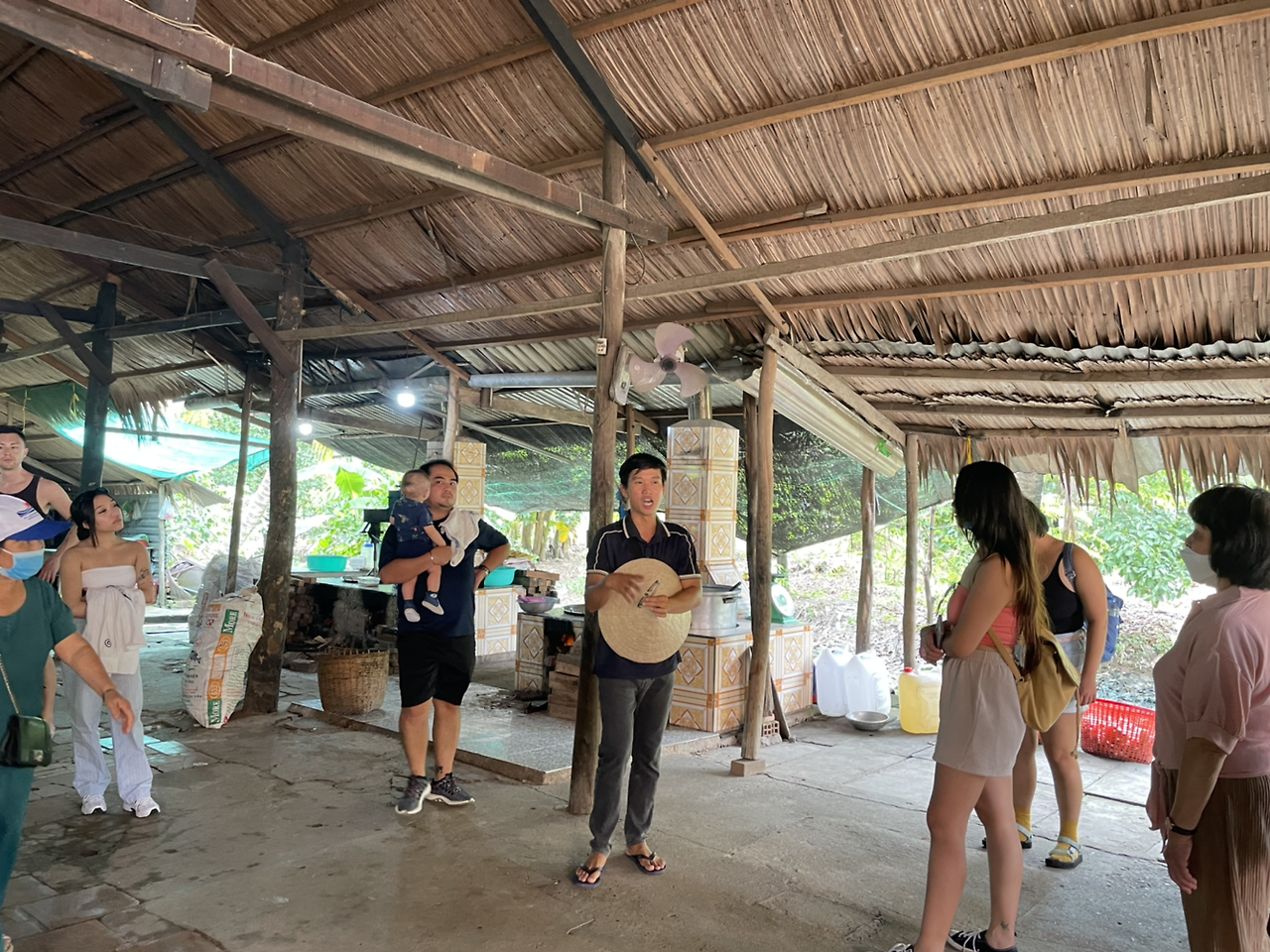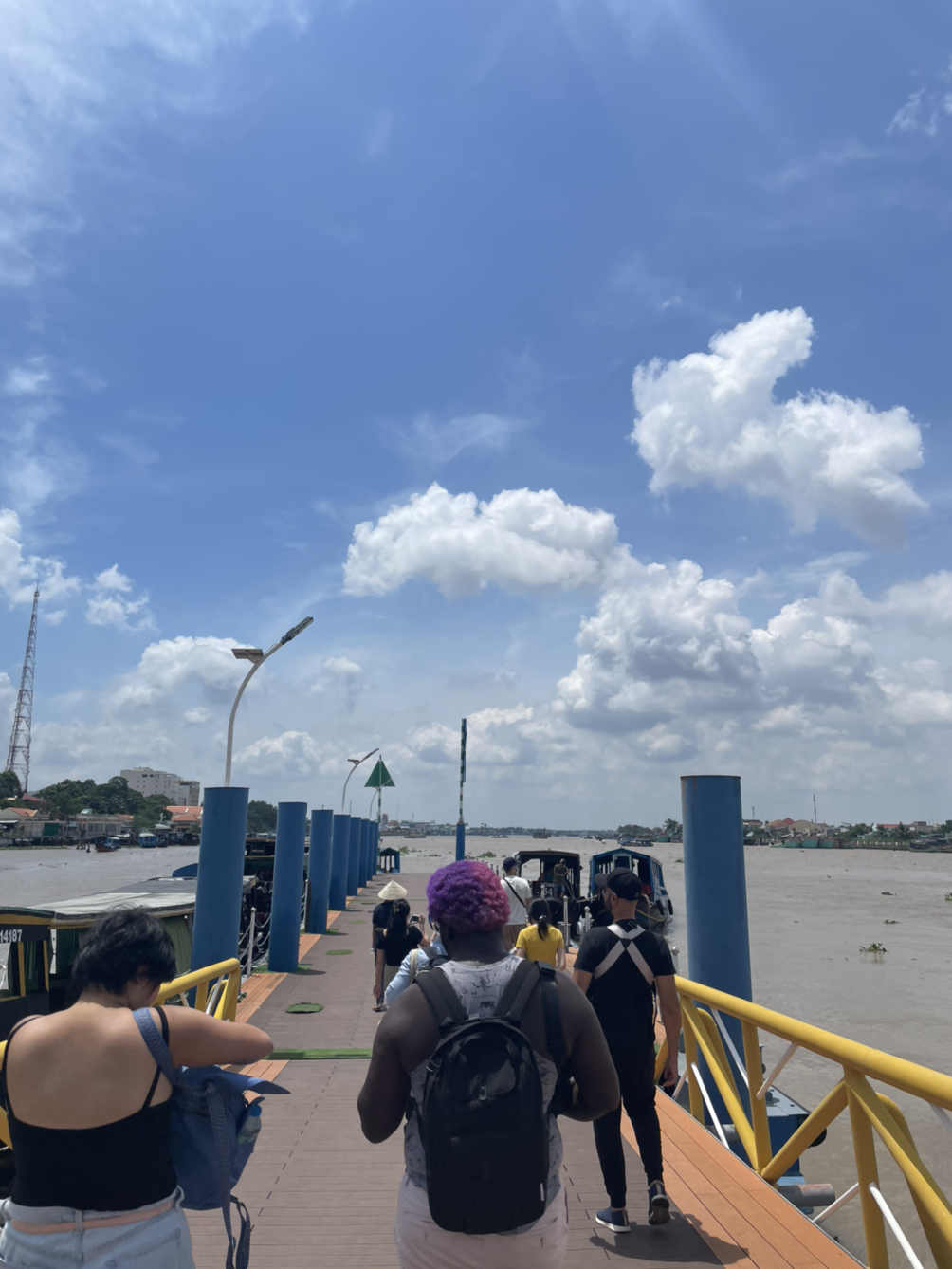 맛있는 열대과일을 먹고 나서 골프 캐디 카트 같은 차를 타고서 몇분 달리고 나니 도착한 곳. 광고로 많이 봤던 메콩강 투어의 묘미. 영상을 찍을 생각에 신이났다. 메콩강에는 물뱀이 많이 산다고 한다. 악어와 위험한 뱀들은 이젠 다 없다고 한다. 아마 인간이 영역을 넓힘과 동시에 점점 서식지를 잃고 사람들의 발자취가 닿지 않는 더욱 더 깊숙한 메콩강으로 잠적을 감춘 것은 아닐까 싶다.