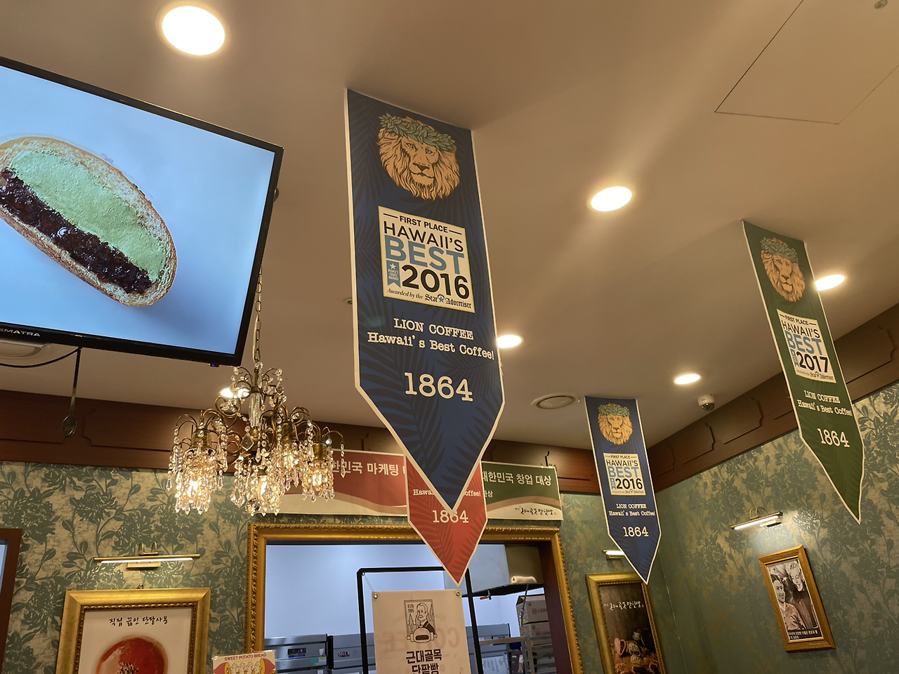 심심해서 여기저기 돌아다녔는데 맛있어보이는 단팥빵집이 있길래 들어가봤다. 유명한 곳인가보다. 하와이 선정 맛있는 커피집으로 뽑혔었나보다. 여기 저기 깃발이 걸려있더라. 단팥빵이랑 찹살떡을 샀다.