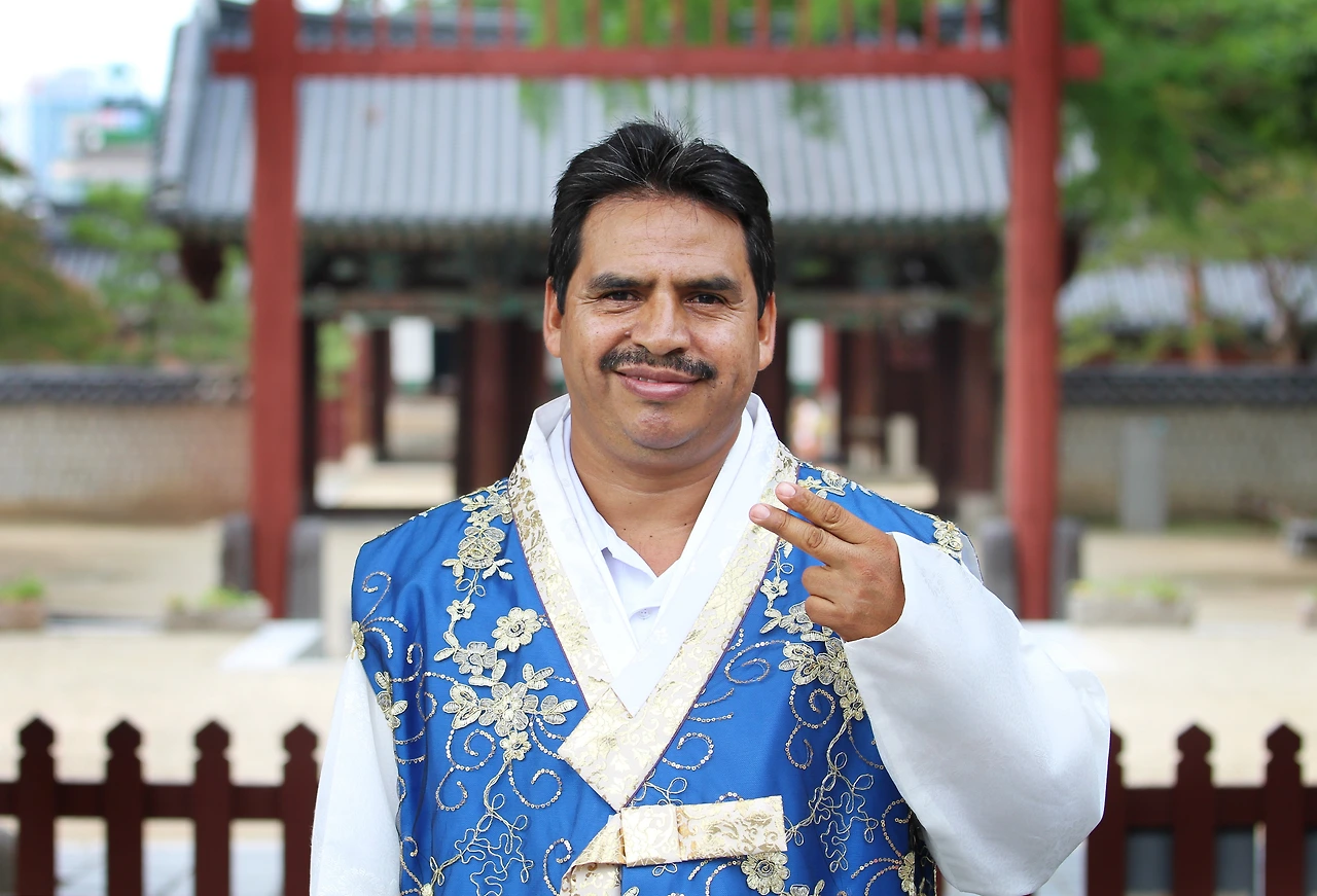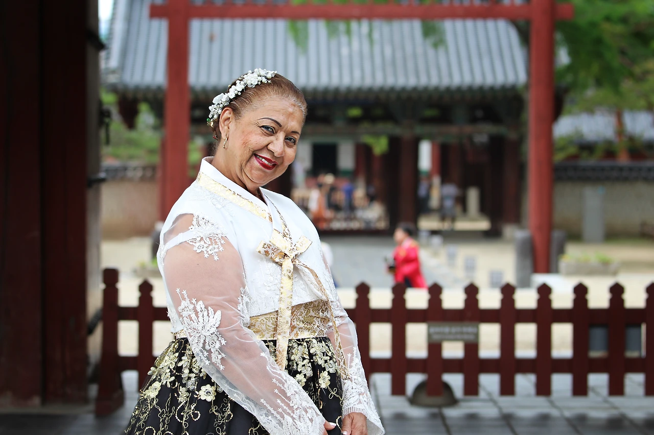전주 한옥마을을 돌아다니다가 예쁜 한복을 입고 한국문화의 발자취를 쫓고 있는 콜롬비아 관광객을 만났다.