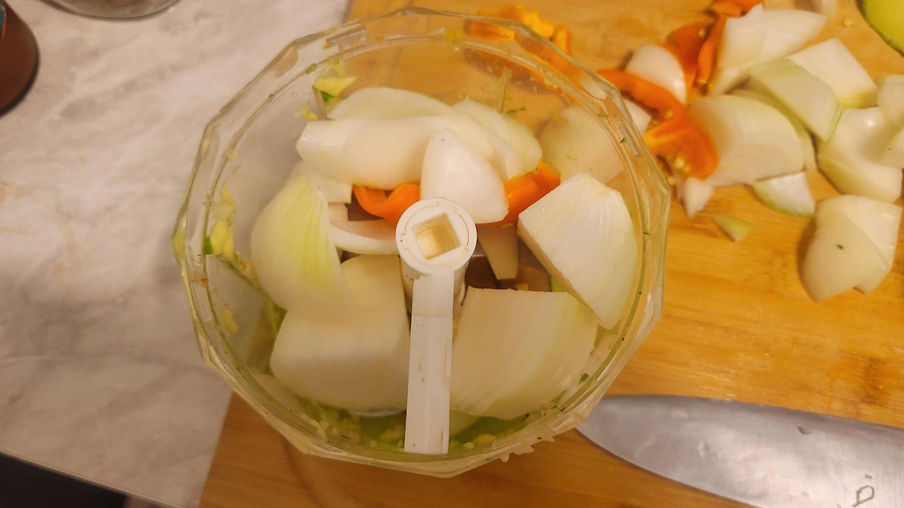 우선 양파, 당근, 호박, 마늘, 파프리카들을 잘게 썬다. 도깨비방망이로 하면 너무 작게 나오는데 이러면 오래 끓이는 라구의 특성상 거의 식감이 느껴지지 않는다. 좀 텍스쳐를 주기 위해서 다이소에서 파는 수동 채칼로 절단. 30번 잡아당기면 맞춤한 크기다.