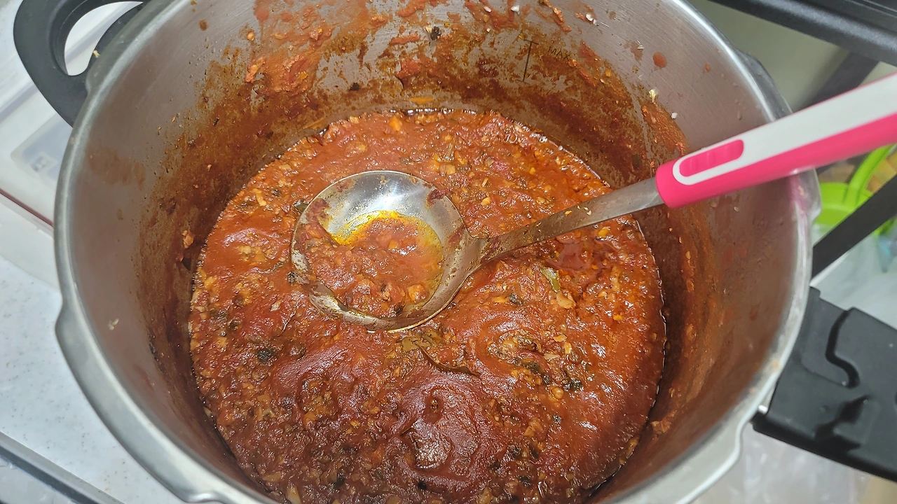 우선은 올리브오일에 재료를 좀 볶고 그 후에 토마토를 넣고 끓인다. 중불로 놓고 끓이다가 용암같이 폴폴 기포가 올라오면 불을 더 줄이고 약불로 놔둔다. 눌어붙지 않게 저어주는 것은 물론 필수지만 10분 정도는 다른 데 갔다와도 눌어붙지 않을 정도의 불 온도가 중요하다.