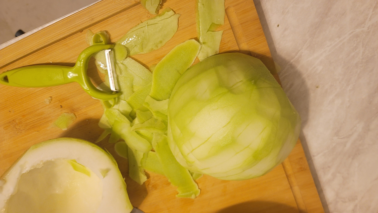껍질도 감자 깎는 칼로 밀면 될 정도의 상태. 푸른 것이 안 보이도록 여러 번 밀어준다.