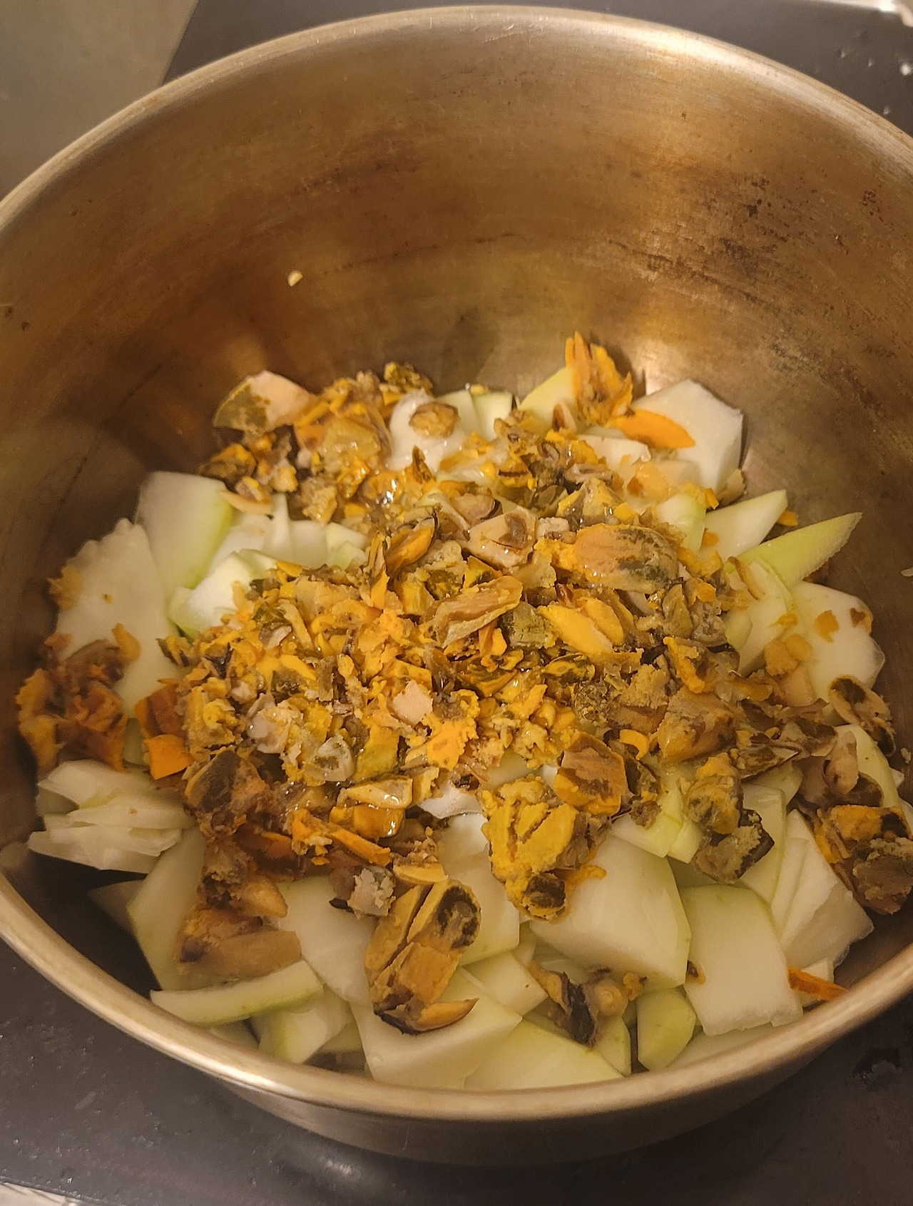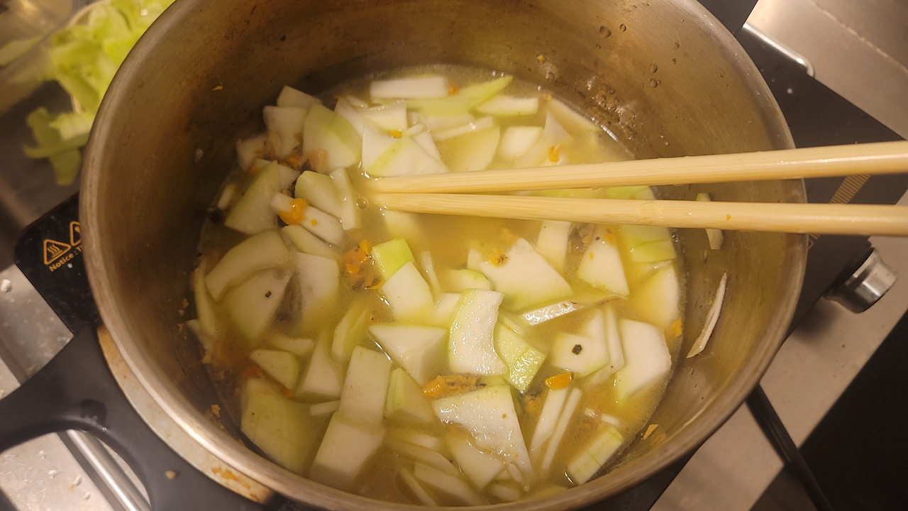 기름에 넣고 좀 볶는다. 기름은 포도씨유를 썼다. 유럽산 포도씨유는 유전자조작 염려가 없어서 범용으로 애용 중이다. 올리브유를 쓴다면 굳이 엑스트라 버진은 권하지 않고 콩기름도 비추다. 유전자조작 여부를 떠나 박은 향이 미묘해서 강한 향의 기름은 쓰고 싶지 않은 기분.