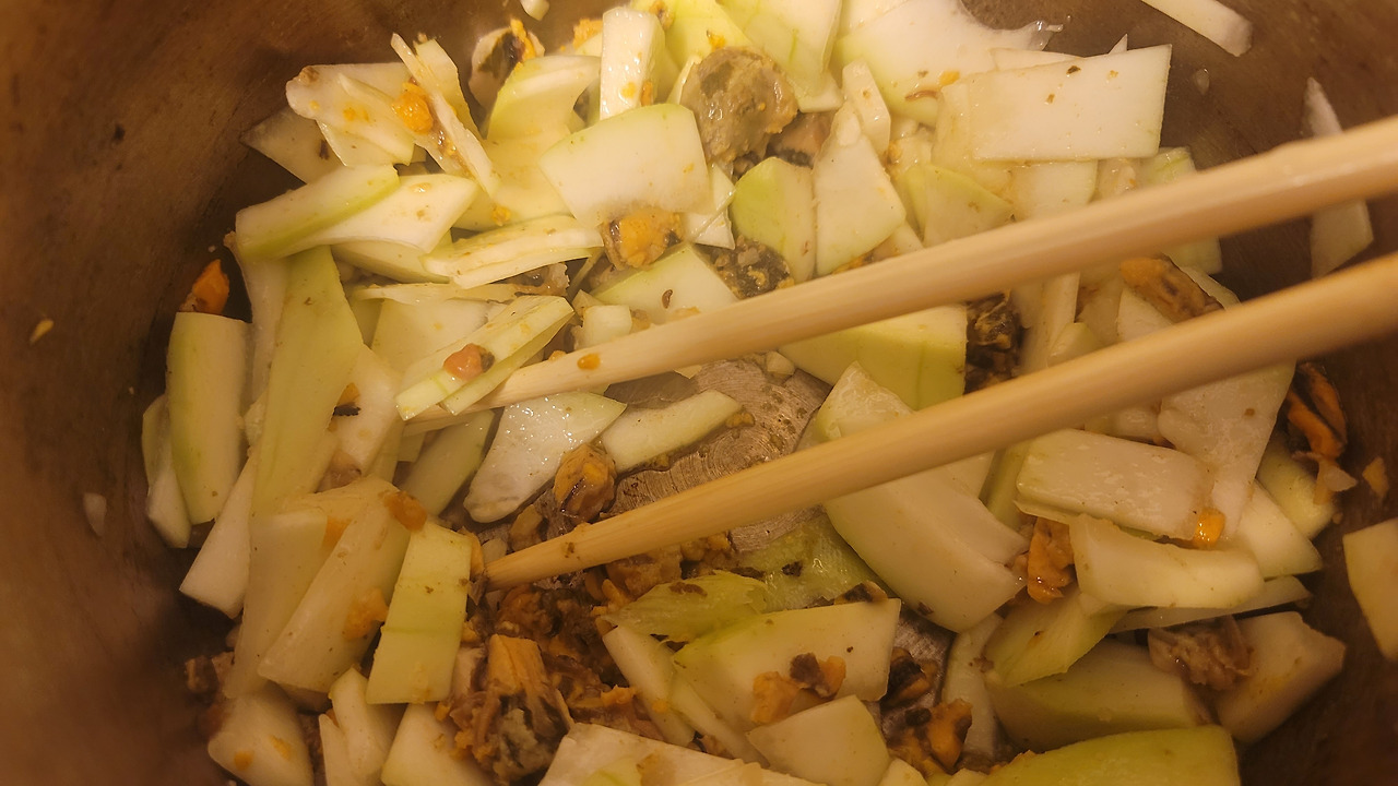 물을 붓고 끓일 때 주의점은 첫째도 둘째도 박의 식감. 박은 청상과부를 상징한다는데(밤마다 달바라기 하면서 피는 하얀 꽃 때문에 그렇단다) 이 색이며 향이며 매끈하면서도 사각한 식감들이 어딘가 모르게 지켜주고 싶은 느낌. 그래서 박이 퍼지지 않도록 너무 볶고 끓이지 않는다. 간도 향이 강하고 색이 진한 간장은 금물. 사실 홍합살의 짠 기운만으로도 간은 충분하다. 참기름도 옛날 식으로 방울 단위로만.