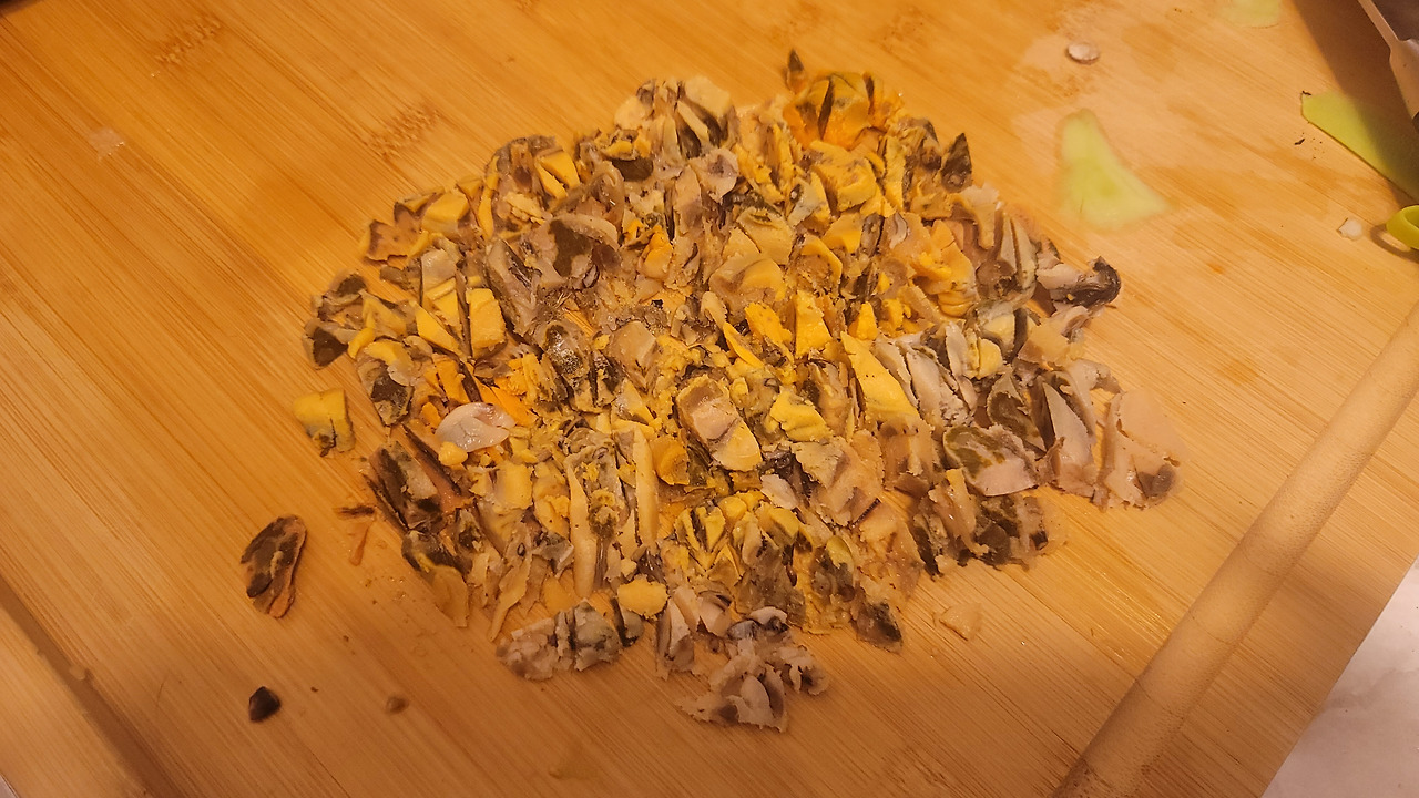 대략 얼음기가 가셔 가는 홍합살은 칼로 다진다.
