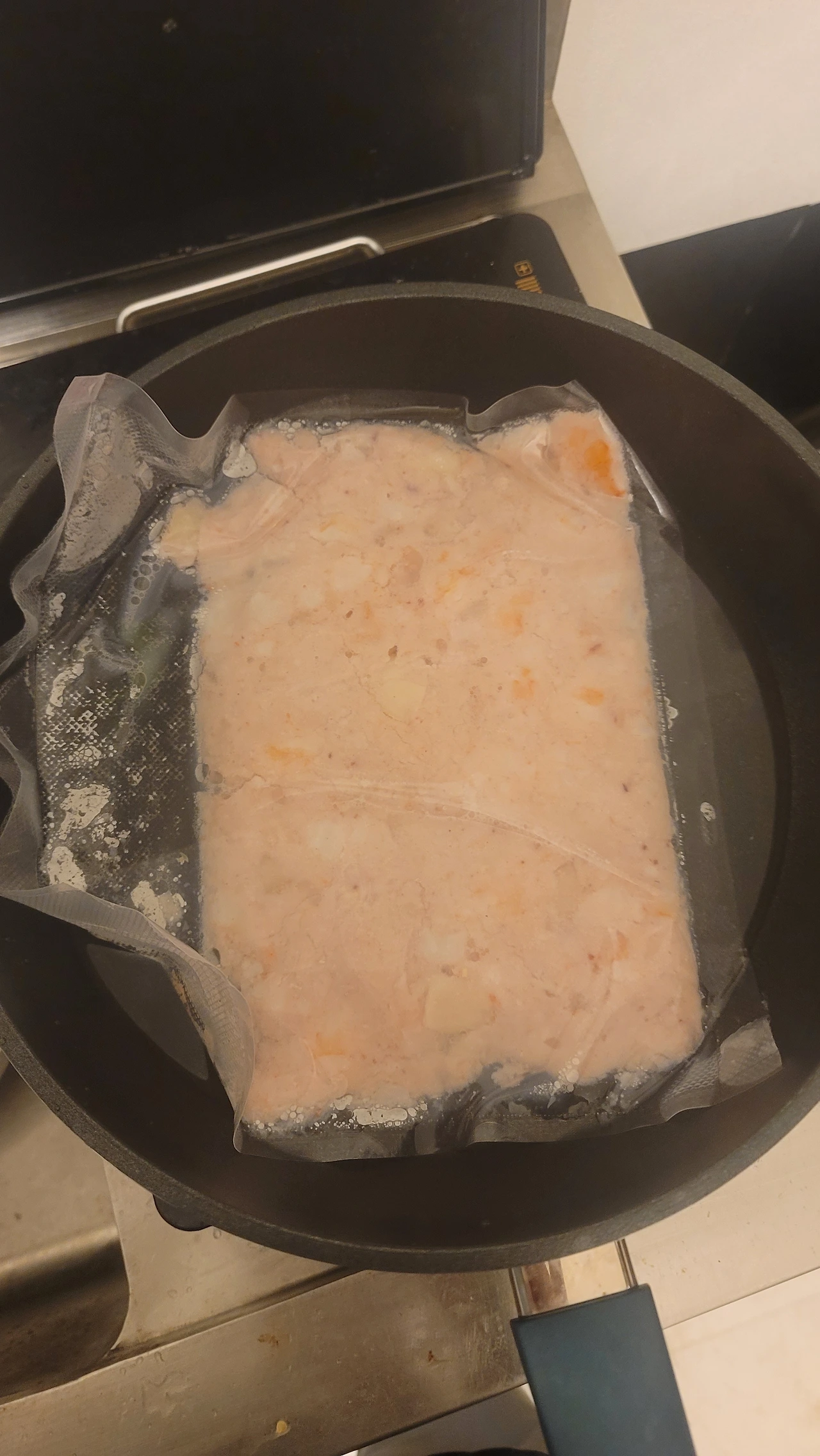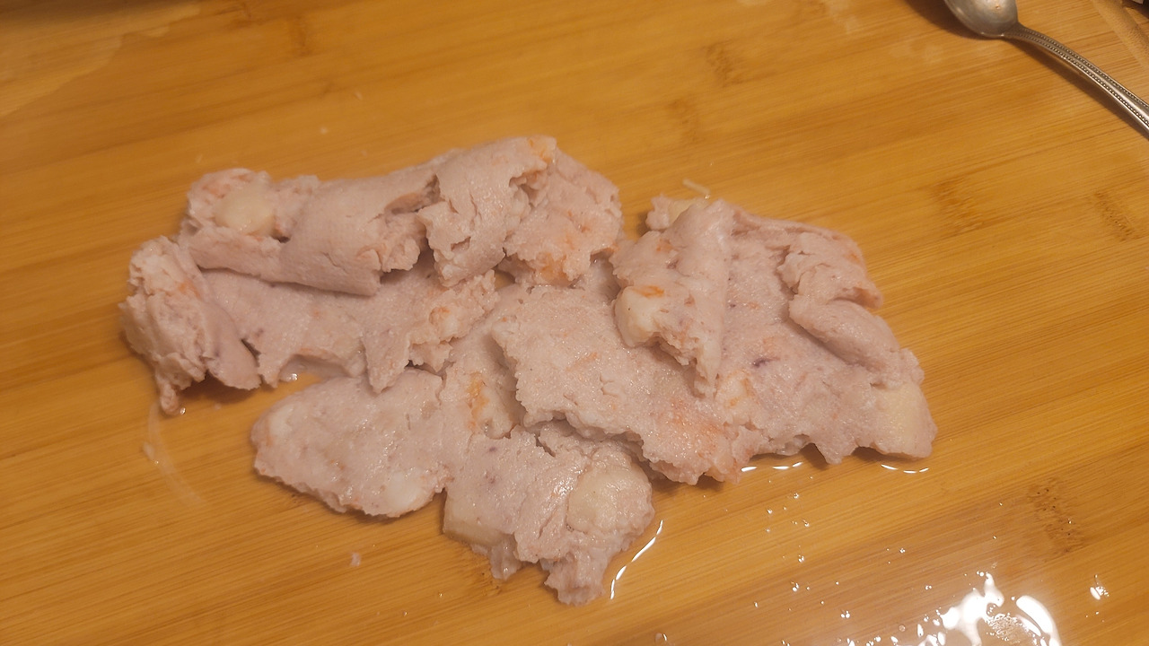 궁극의가 아니라 궁극으로 향하는 첫걸음의 피시케이크. 수비드 온도가 낮아서 매우 부서지기 쉬운 상태의 텍스쳐. 손님상에 나갈 상태가 아니다. 이것도 진공포장은 했지만 오래 둔다고 좋아질 물건 아니니 빨리 먹자 싶다.