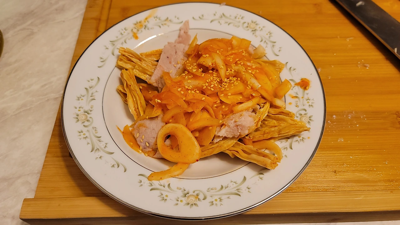 그래서 주물주물 잘 버무려 나온 부죽 무침은 상당히 만족스럽다. 밥반찬으로도 좋고 그냥 이대로 한 끼 식사로도 좋다. 피시케이크는 살짝 겉도는 느낌인데 이건 골뱅이 사다 익혀서 넣으면 훨씬 잘 어울리겠다.