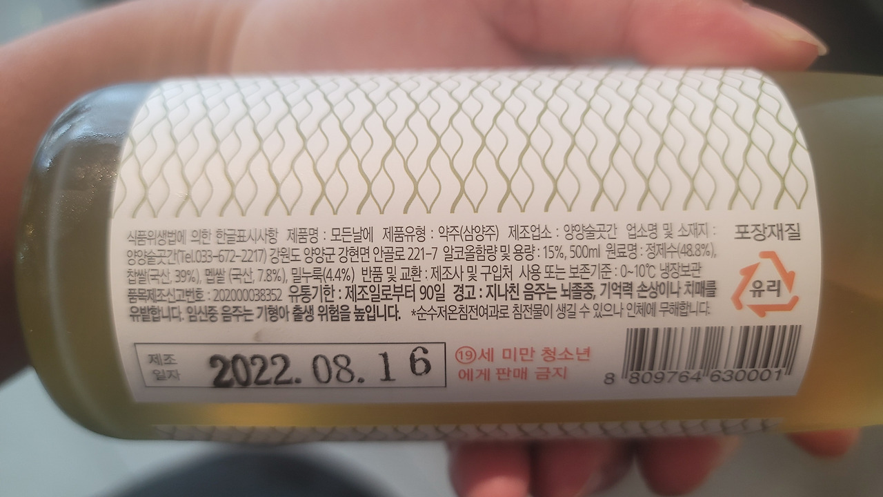 잠시 청주와 약주의 차이에 대해서 짚을 필요가 있다. 쌀로 만든 술을 맑은 부분만 걸러 마시는 것을 청주(탁주에 대조하는 의미도 있어서)라고 했다. 그런데 일제강점기 때 만들어진 주세법 이래로 청주는 누룩을 안 쓰는(1퍼센트 이하)술을 말하고 전통 방식으로 누룩을 쓰는 술은 약주로 분류를 해버렸다. 그 주세법은 아직도 이어지고 있고 말이다. 가히 호부호형을 금한 법이다.