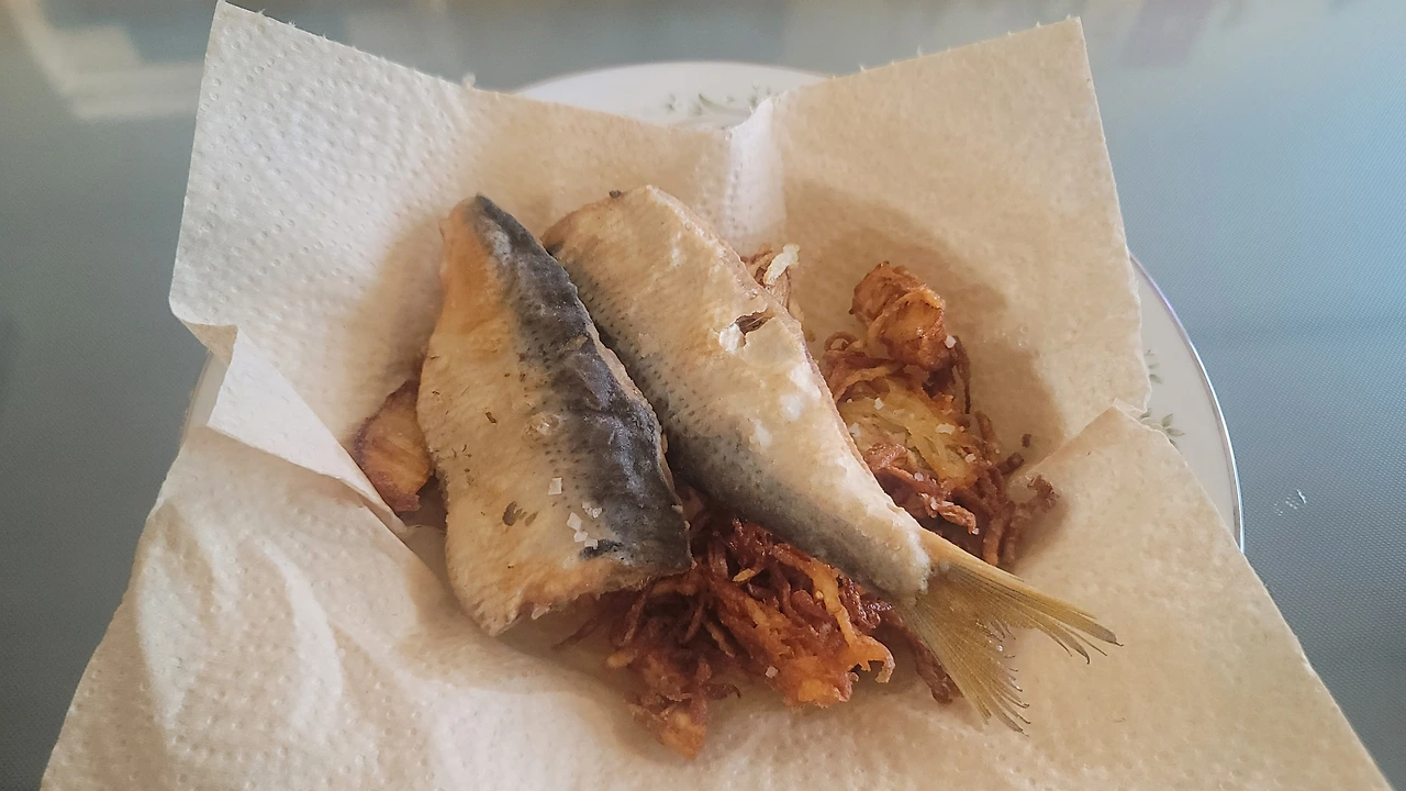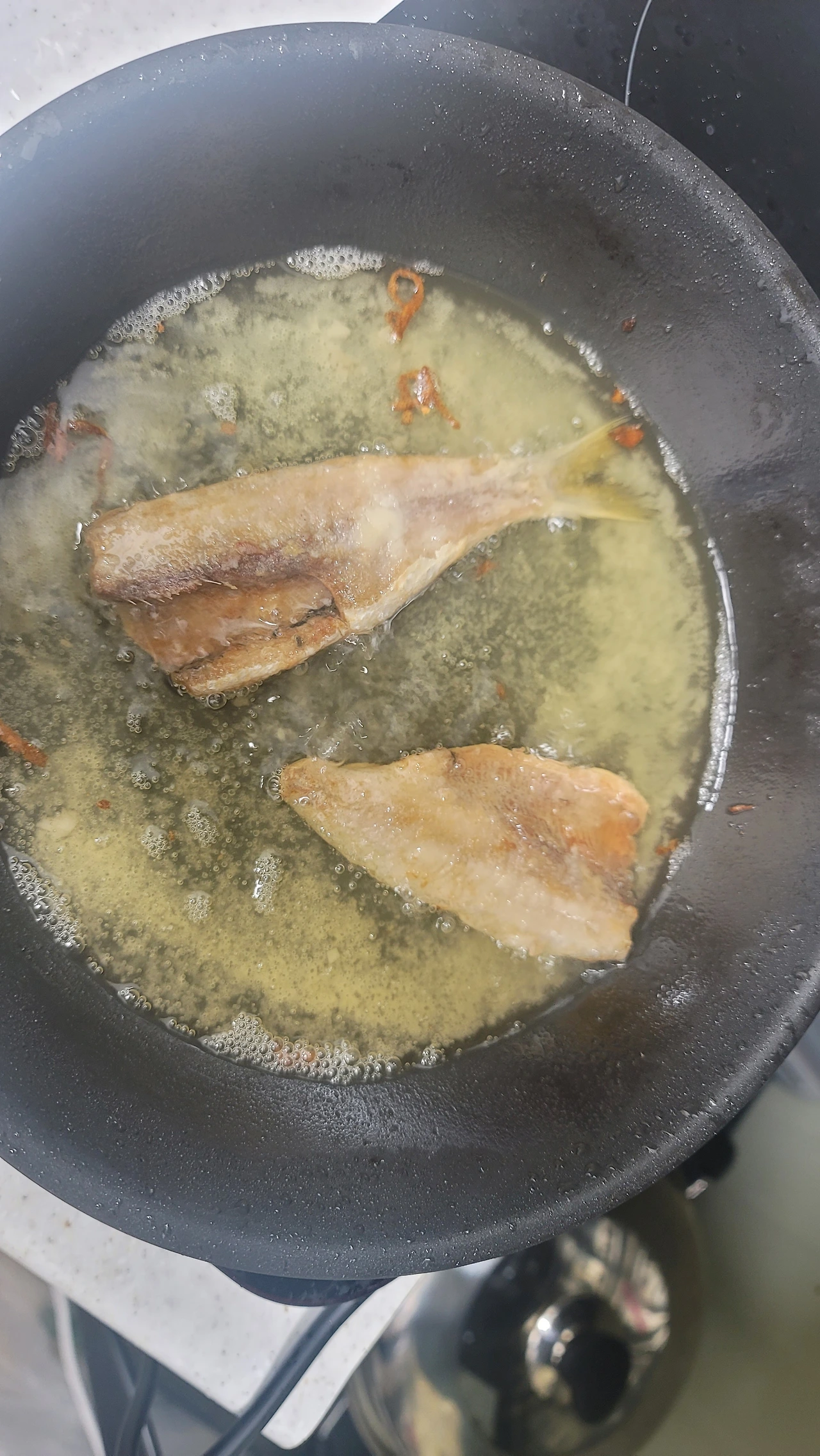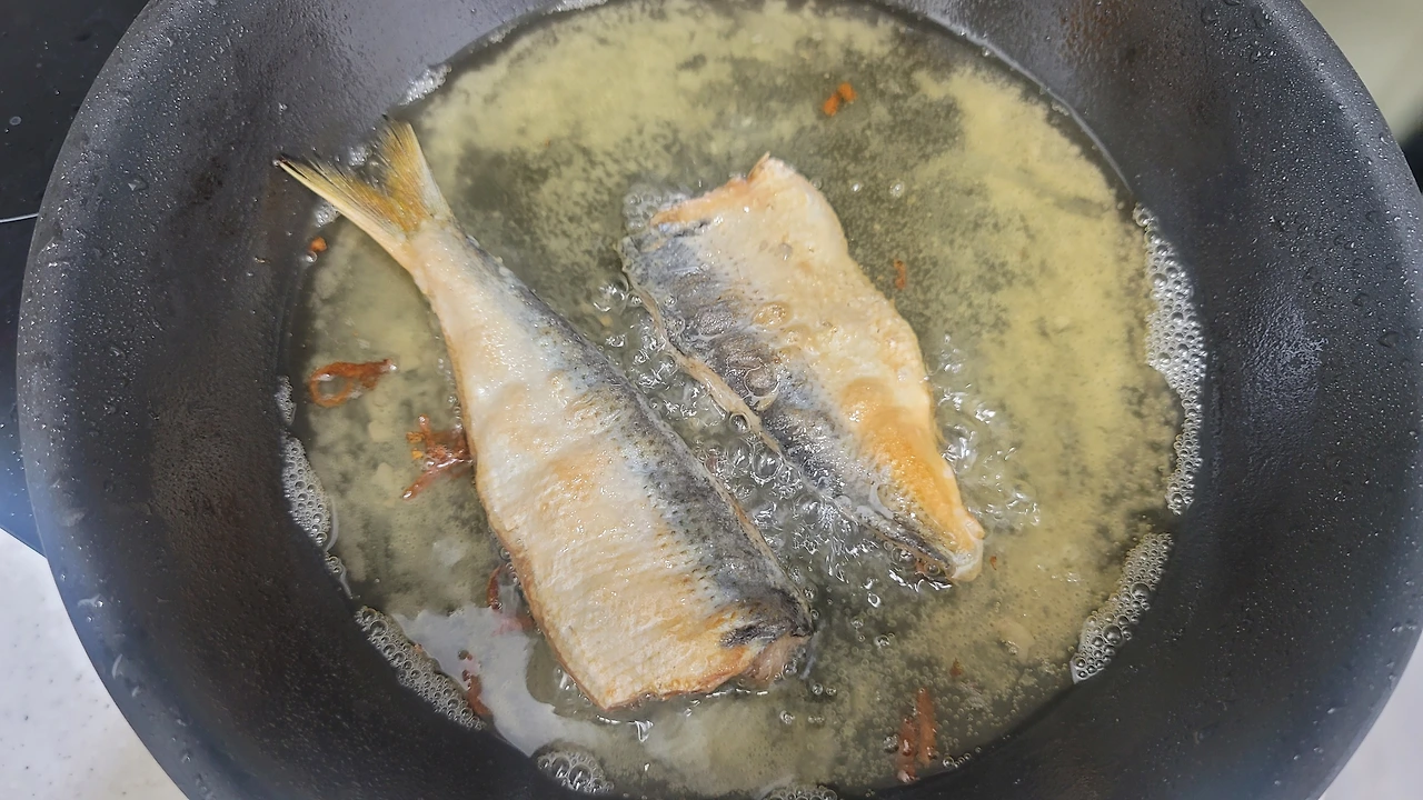 그리곤 밀가루를 입힌 포뜬 전어를 튀기는 거다. 계란물 없이 밀가루만 덮어서 넣었더니 떨어지는 게 많아서 표면이 그대로 드러났다. 하지만 전혀 섭섭하진 않다. 황금빛으로 빛나는 전어 표면을 보고있자니.