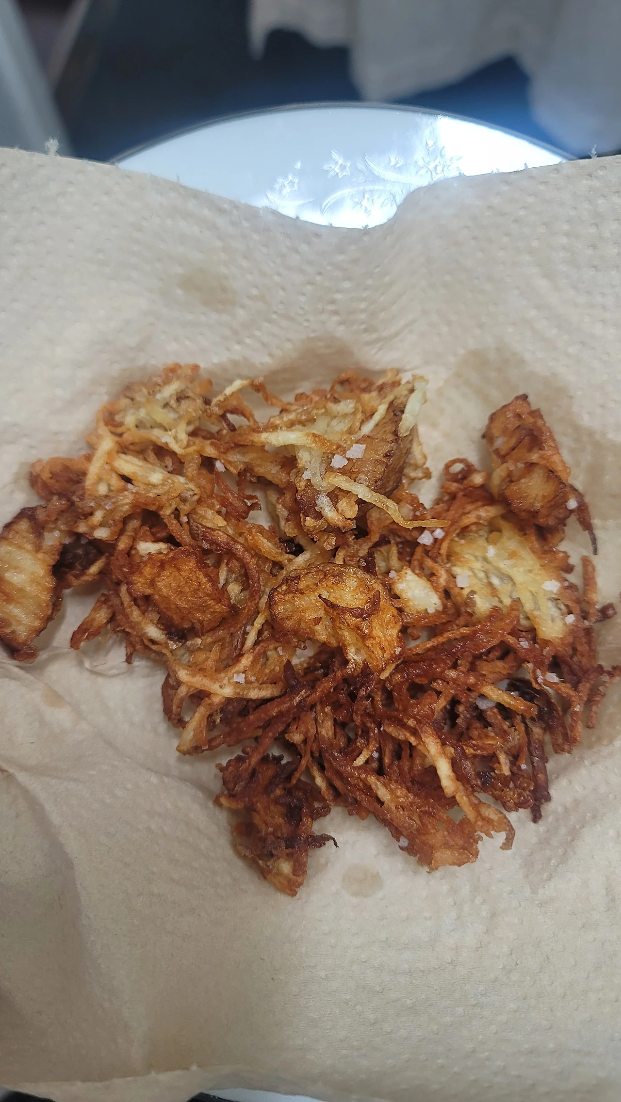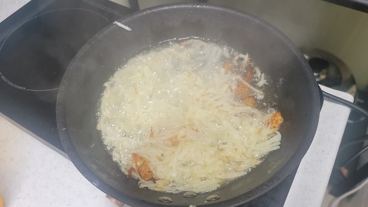 감자는 채칼에 밀어서 별 처리 없이 기름에 담근다. 기름은 이 감자들이 다 잠길 정도도 안 썼다.