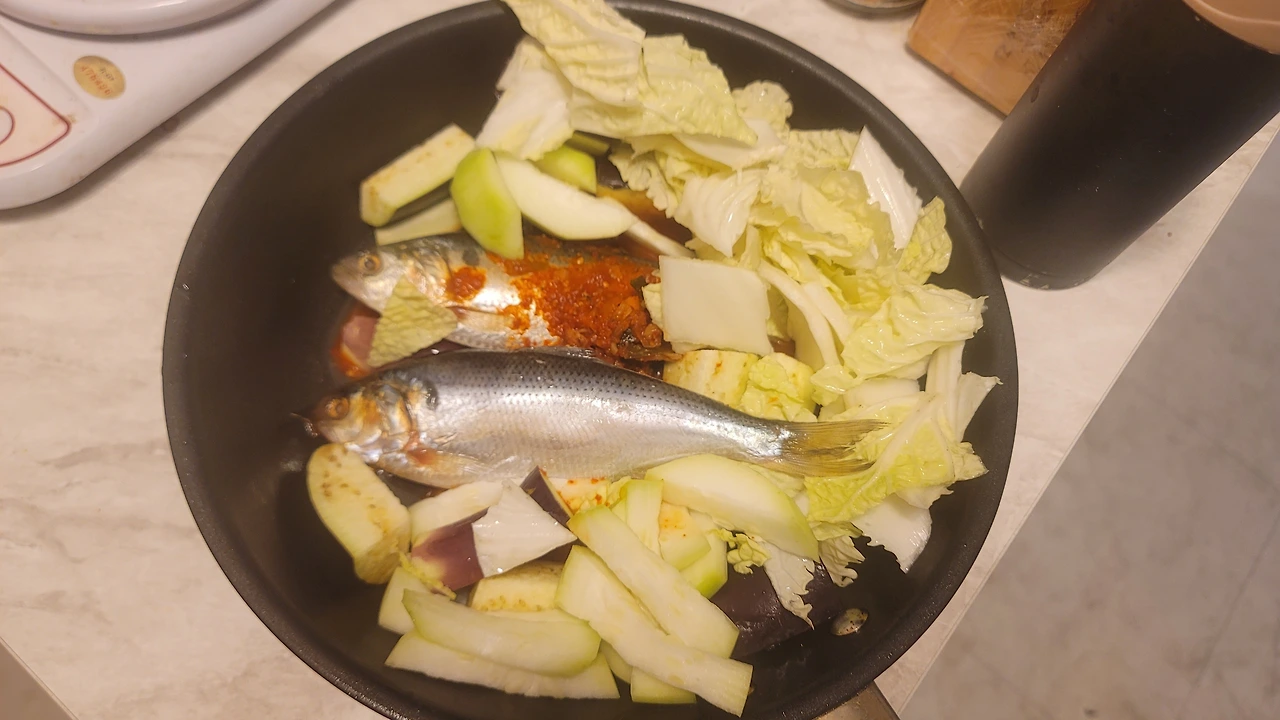 불에 올리기 직전에 배추도 발견. 그럼 배추도 들어가자. 그리고 전어 한 마리가 너무 적은 것 같아서 전어도 한 마리 추가. 이름도 맨 앞에 올렸으니.